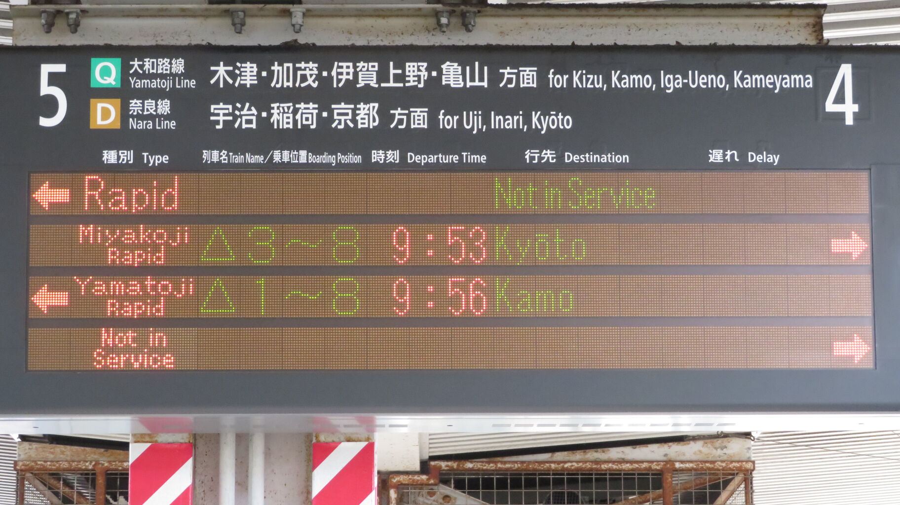 基本的に、JR奈良線 京都方面の電車が4番のりば、大和路線 加茂方面の電車が5番のりばから発車します。