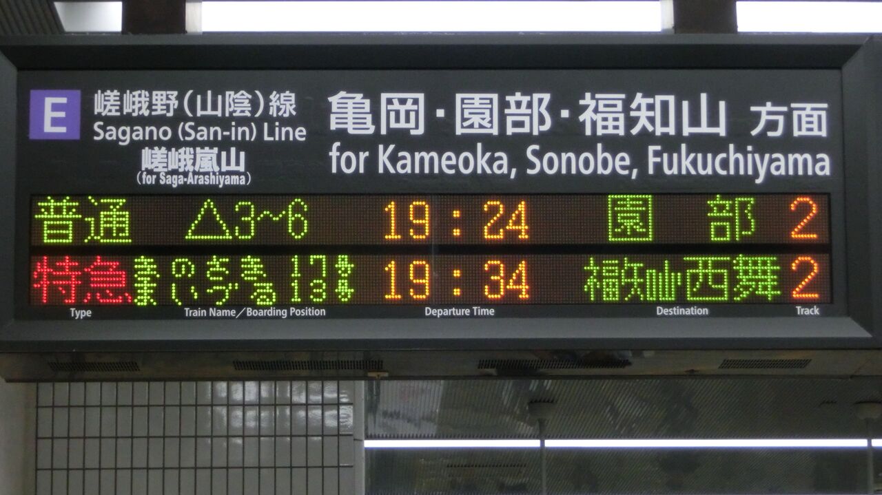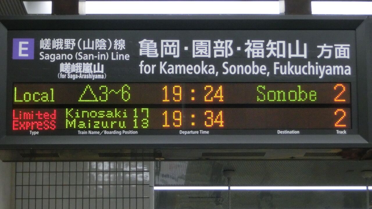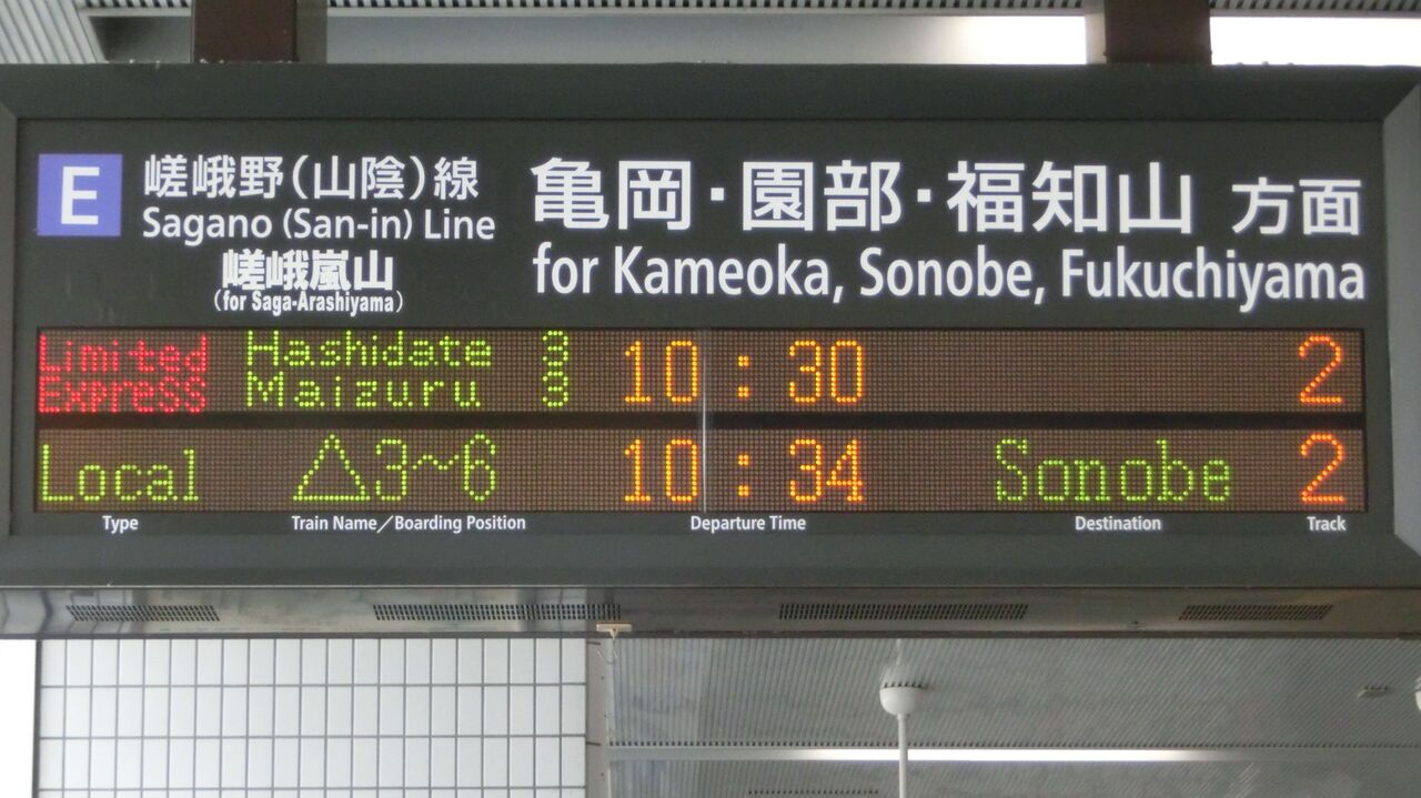 前回の記事で紹介したとおり、京都駅では 発車標に 「福知山・西舞鶴」 といった表示を出せないためか、行き先欄が無表示でした。