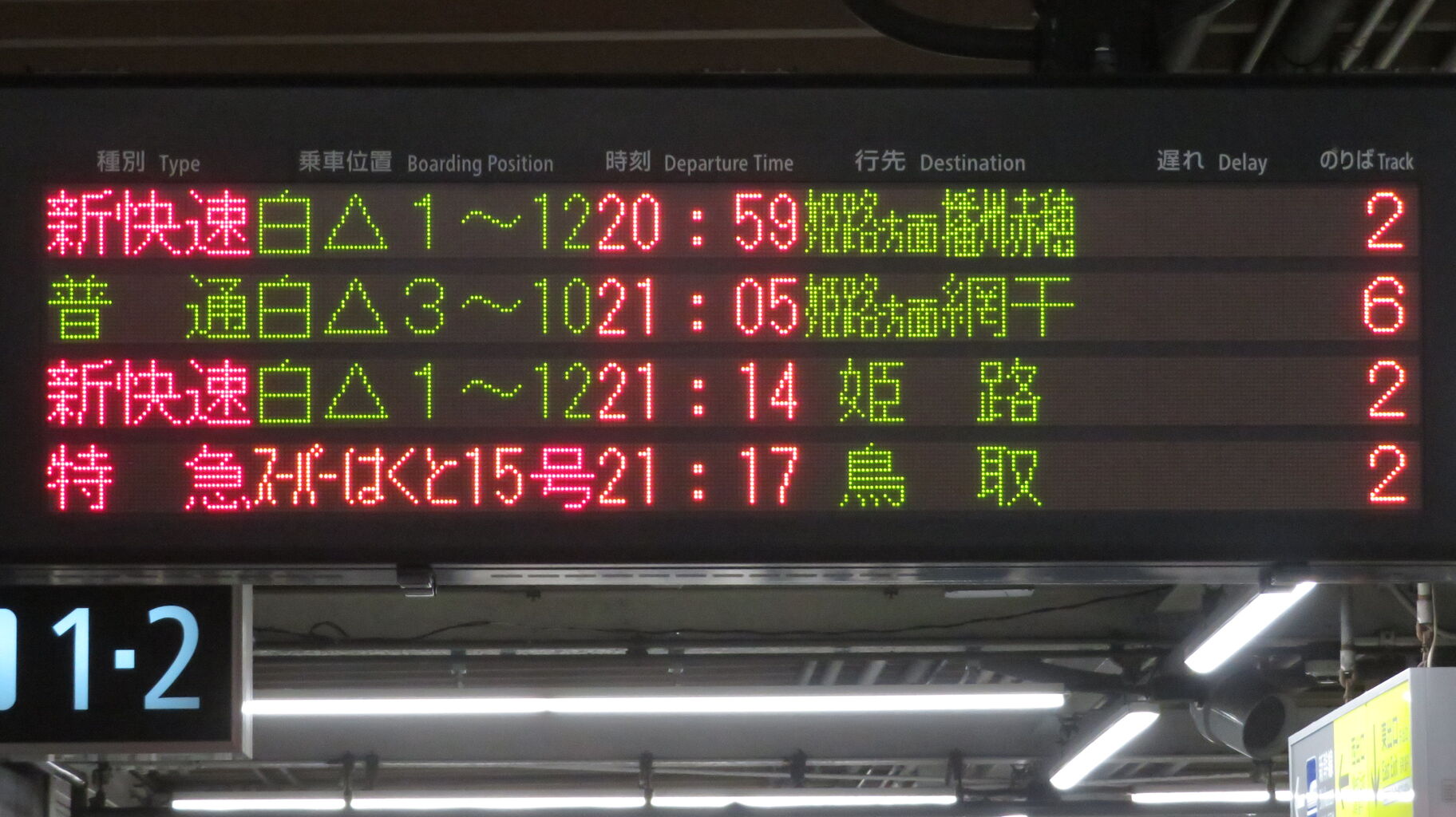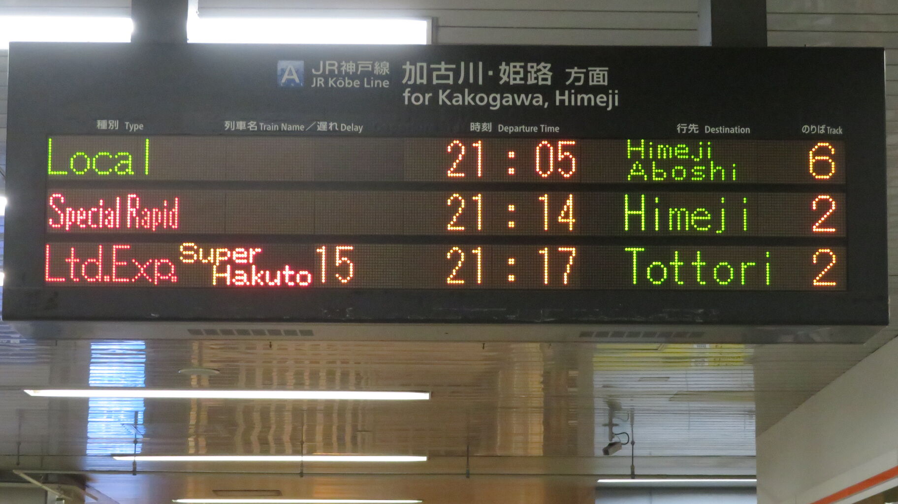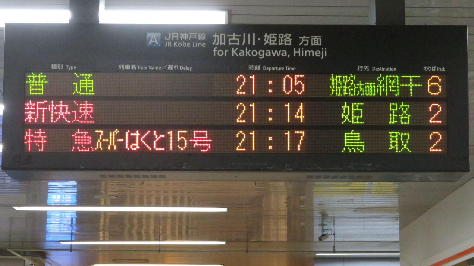 一番下の段に、特急スーパーはくと15号 鳥取行きの表示が出ました。