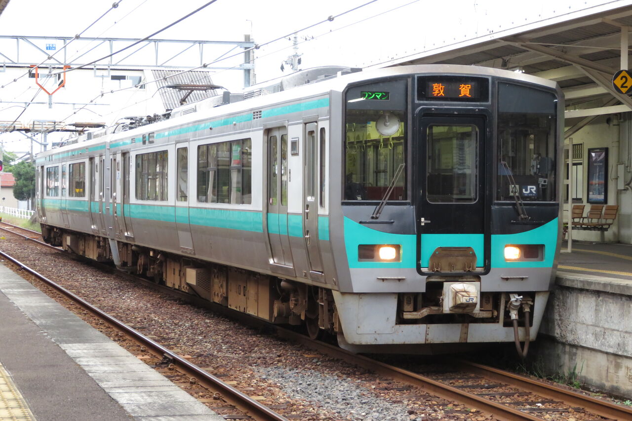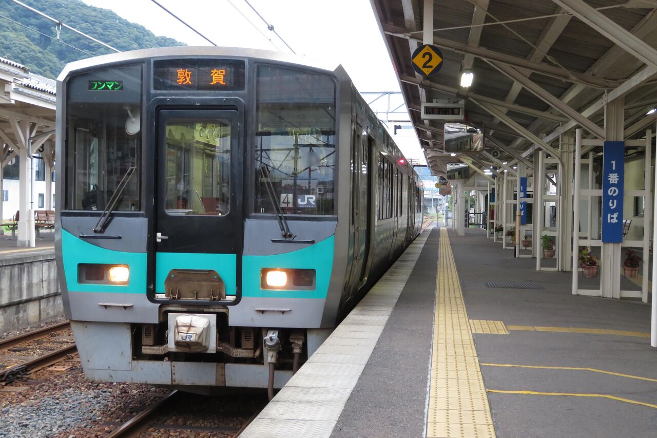 2・3番のりばで駅名標を撮っている間に、1番のりばに敦賀行きの電車が入線してきました。