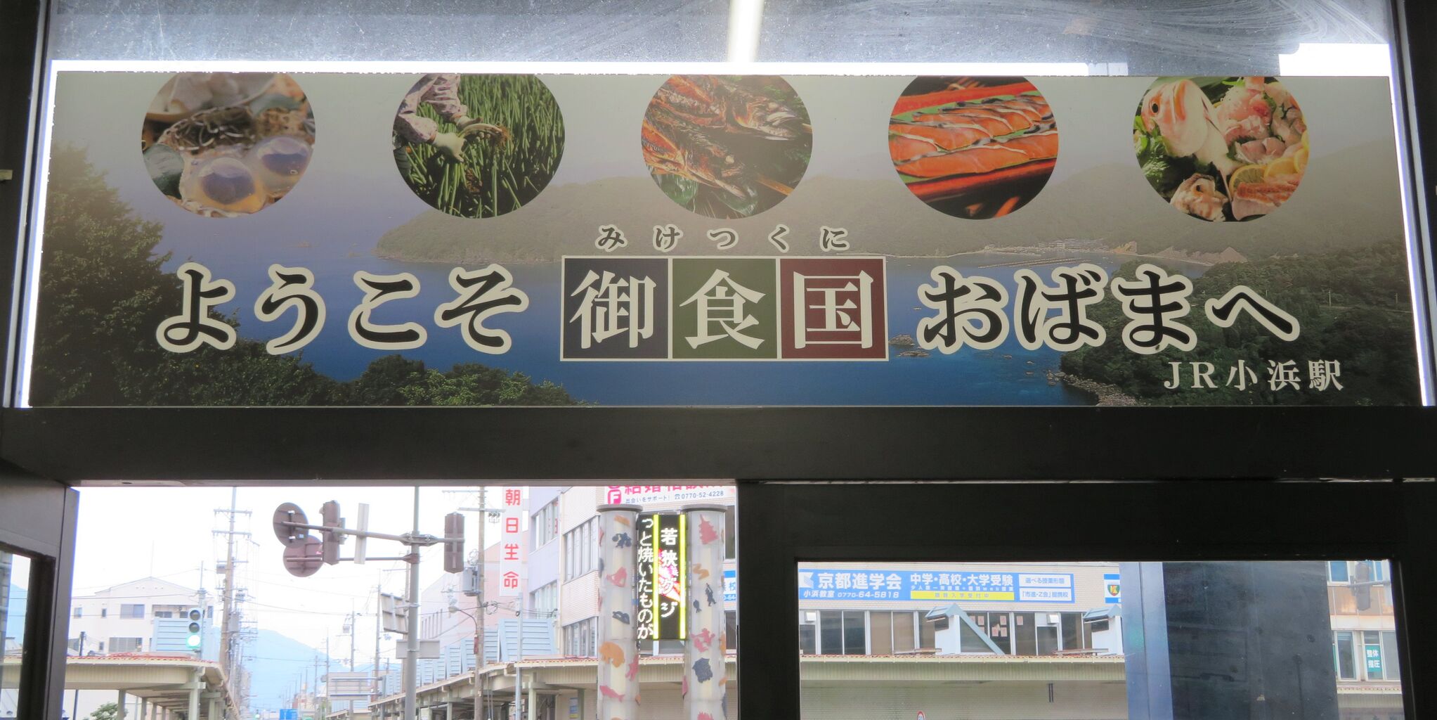 駅舎の出口には、「ようこそ 御食国(みけつくに)おばまへ」 と書かれた歓迎看板が設置されています。