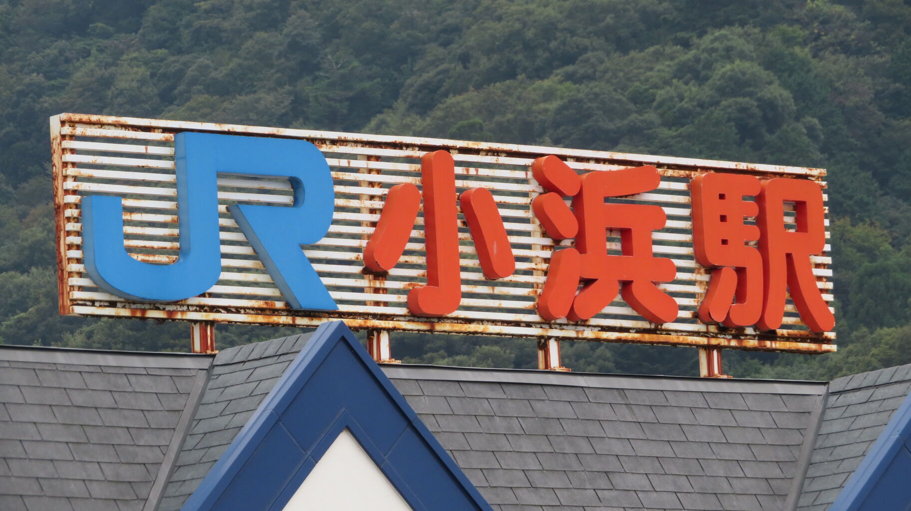 小浜駅の駅舎を撮影。 青い三角屋根が特徴的です。