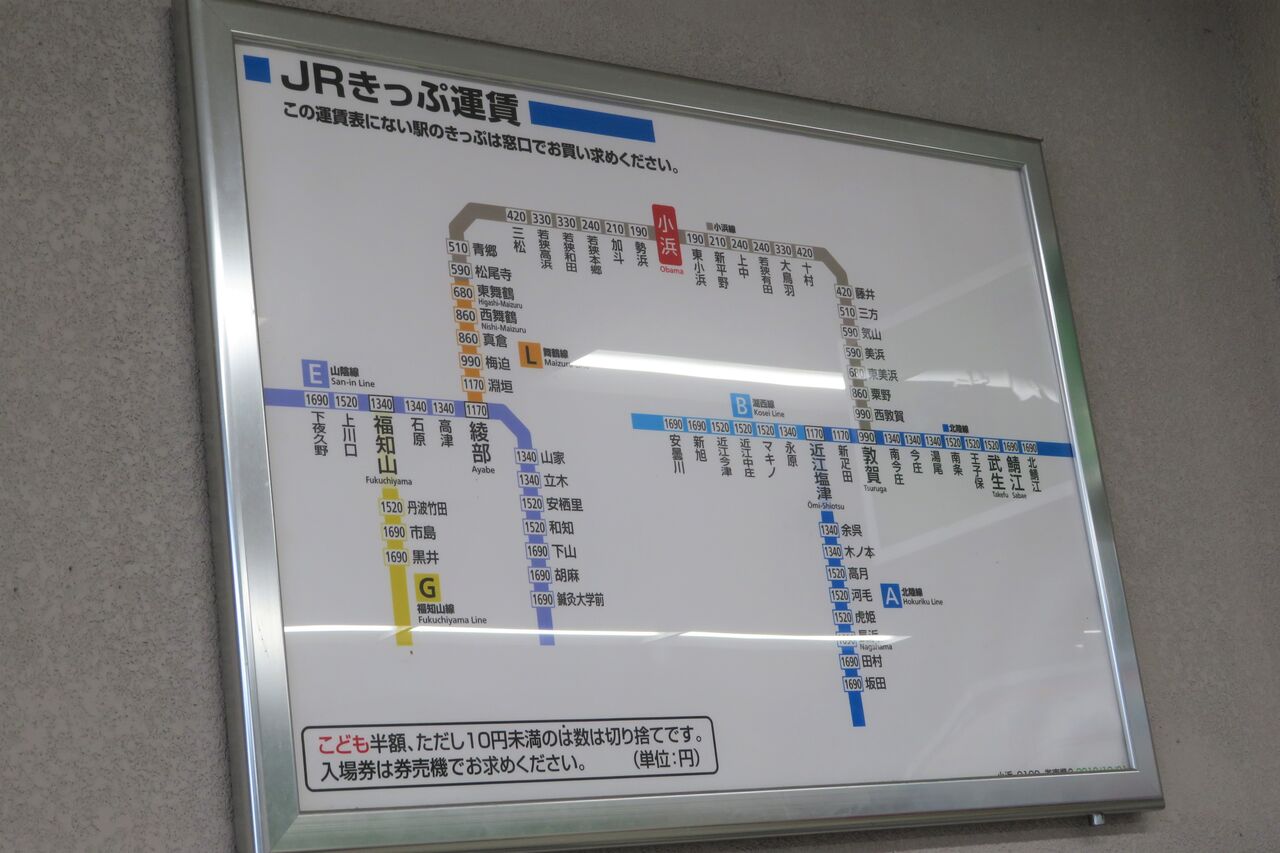 小浜線は 路線記号・ラインカラー共に設定されておらず、運賃表では灰色で表示されています。