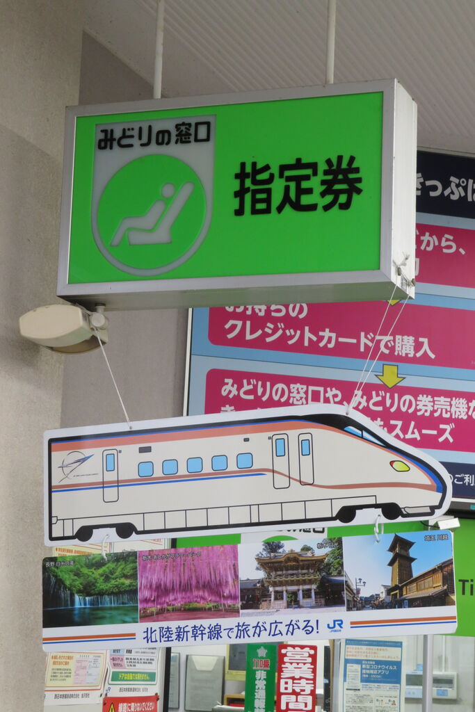 みどりの窓口の案内看板と、そこに吊り下げられている 北陸新幹線のPR看板を撮影。