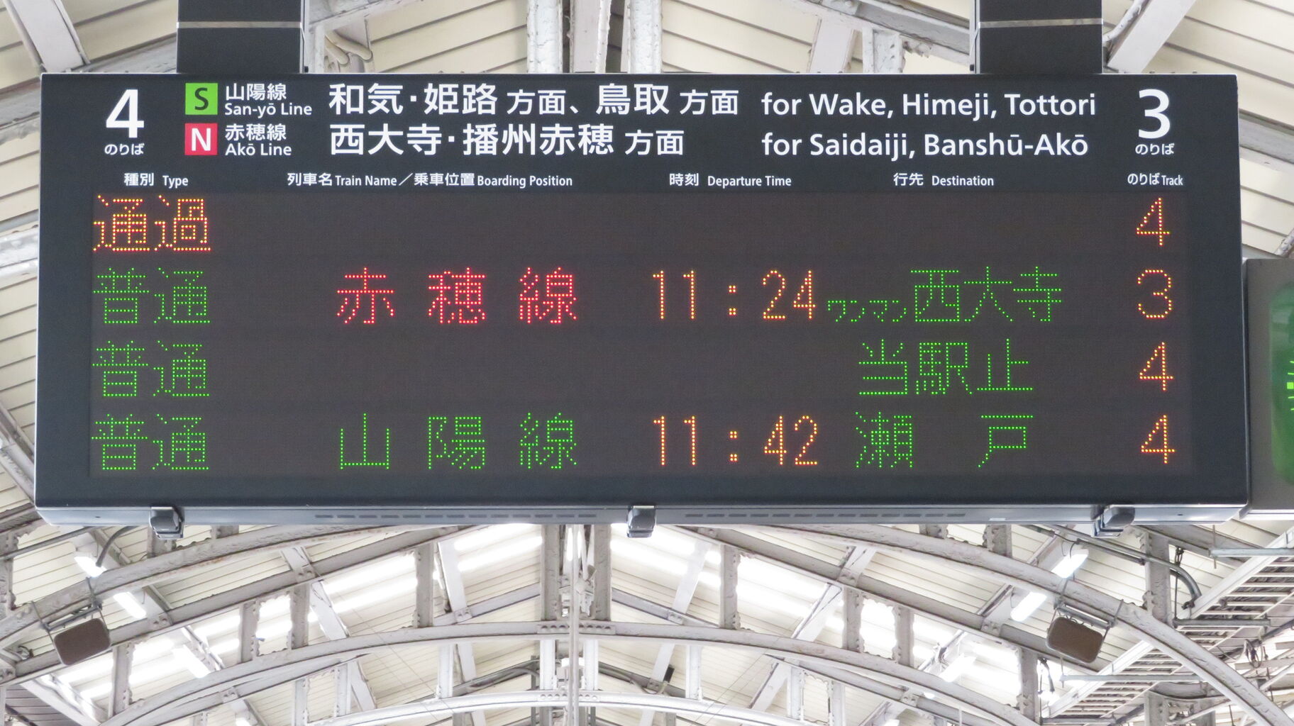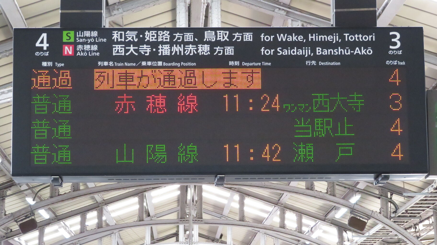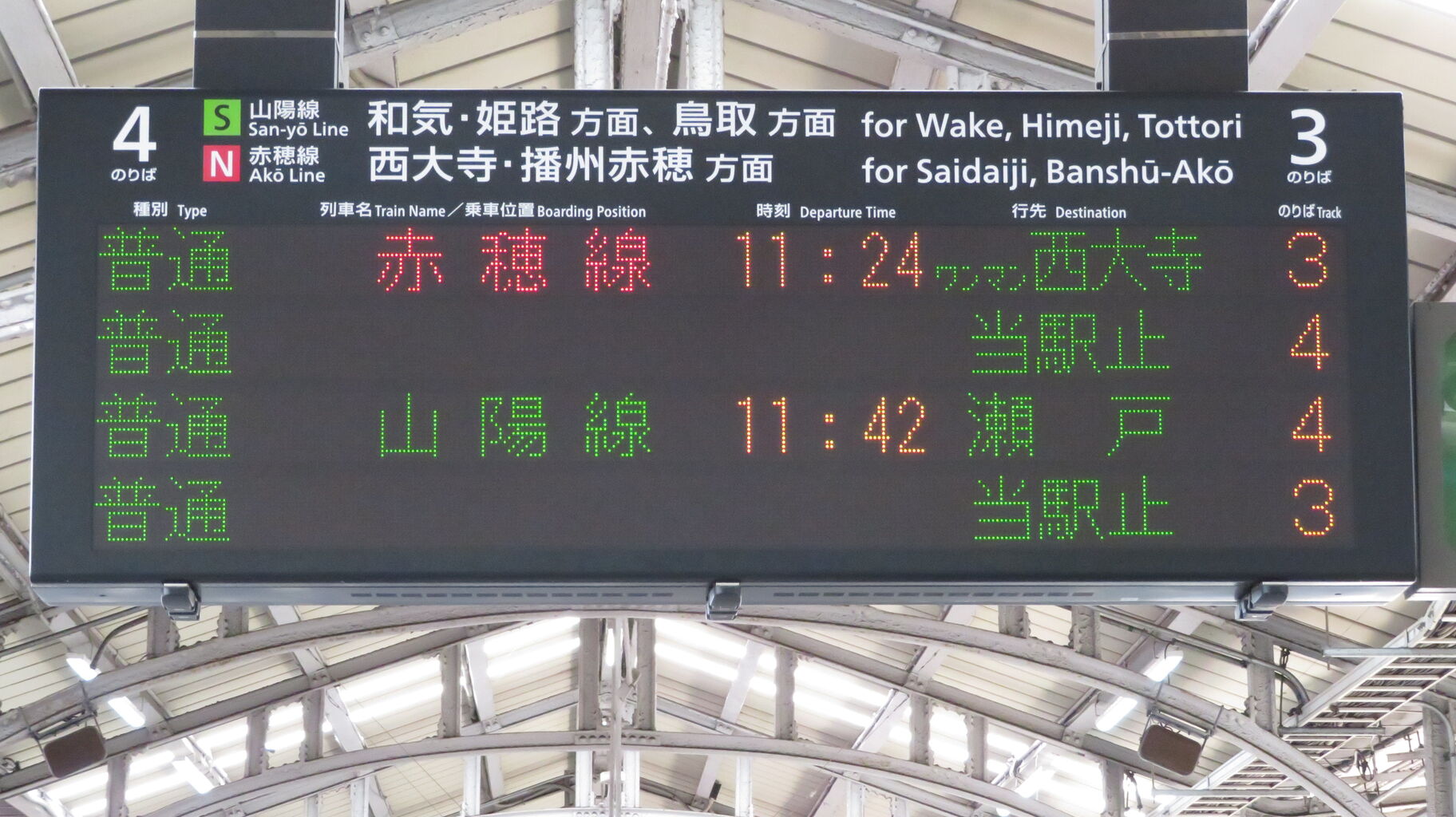 赤穂線の発車案内に 「ワンマン 播州赤穂」 と 「ワンマン 西大寺」 が並んで表示されています。