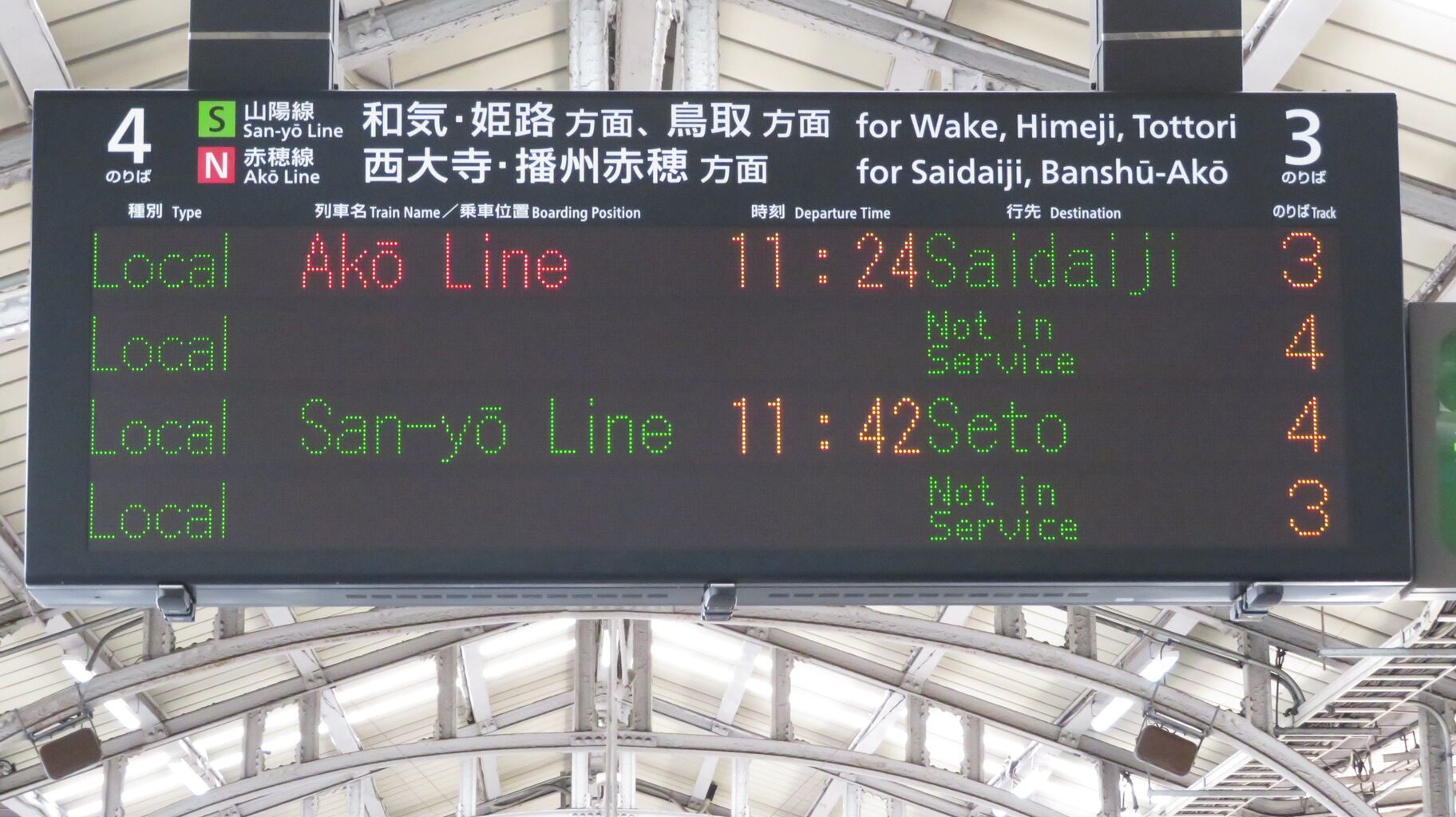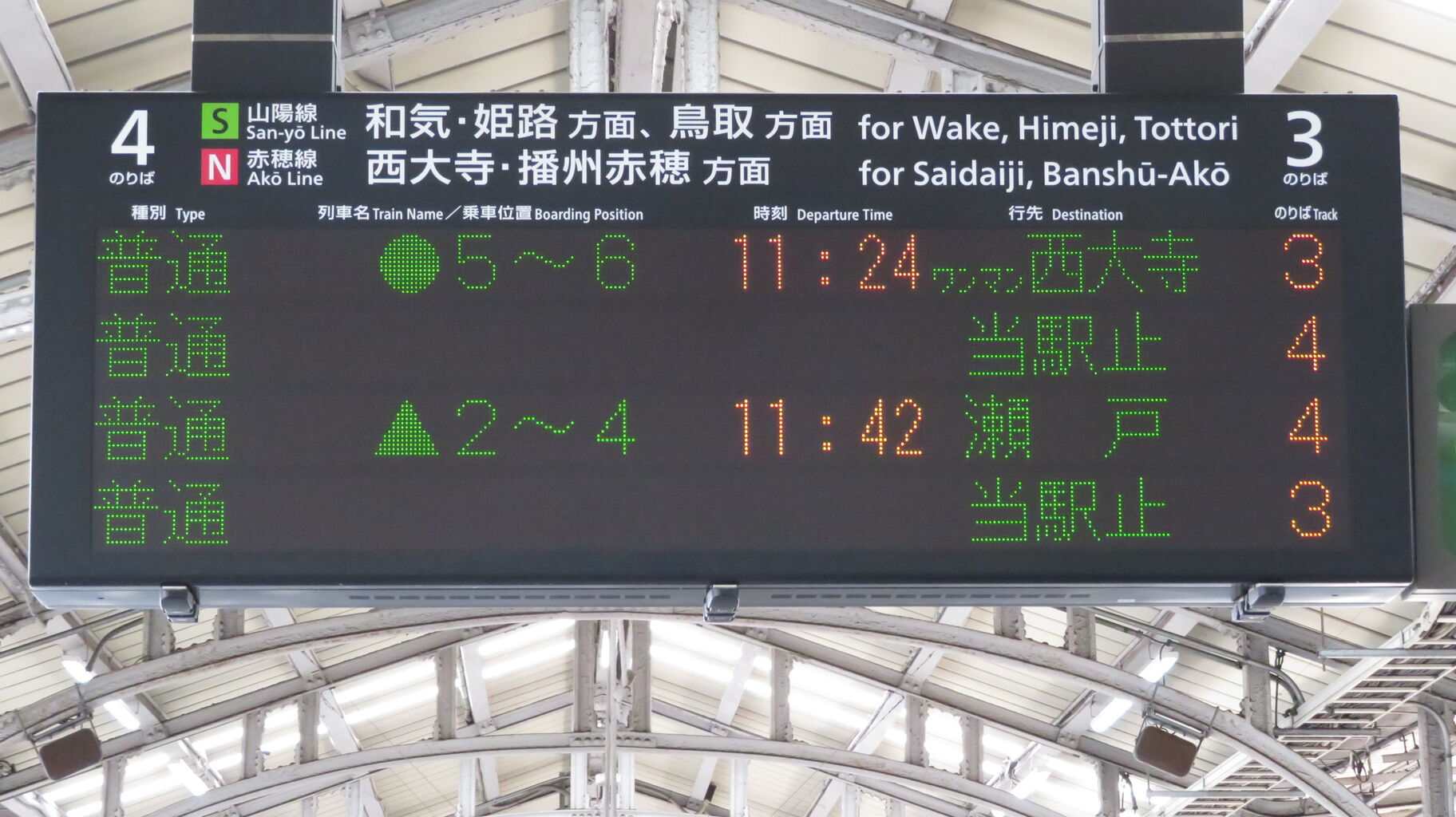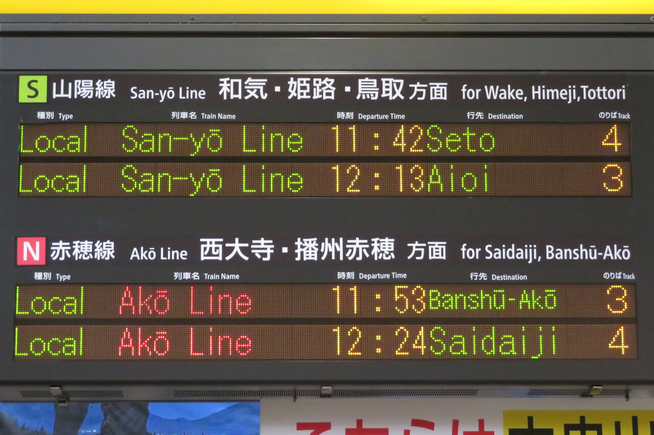 赤穂線の発車案内に 「ワンマン 播州赤穂」 と 「ワンマン 西大寺」 が並んで表示されています。