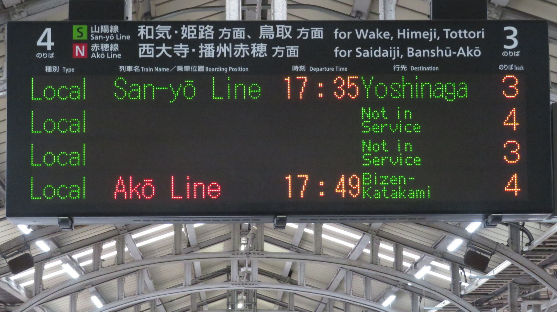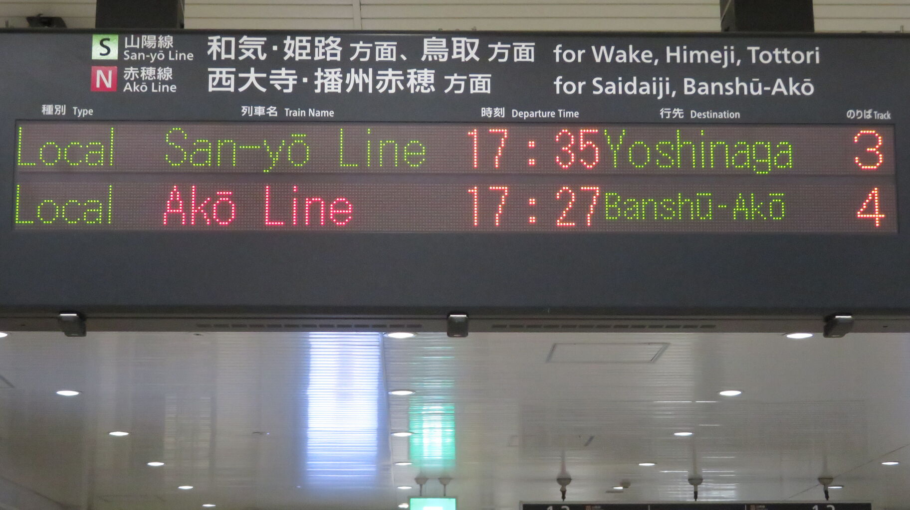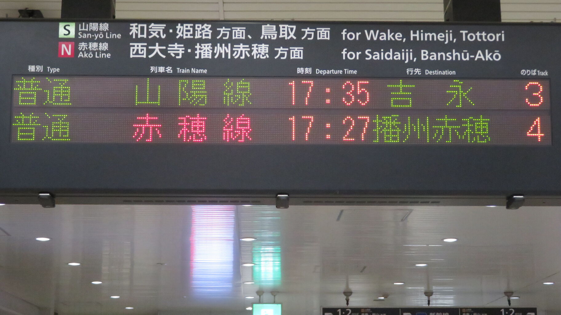 上の段に山陽線上り(姫路方面)、下の段に赤穂線の発車案内が表示されます。