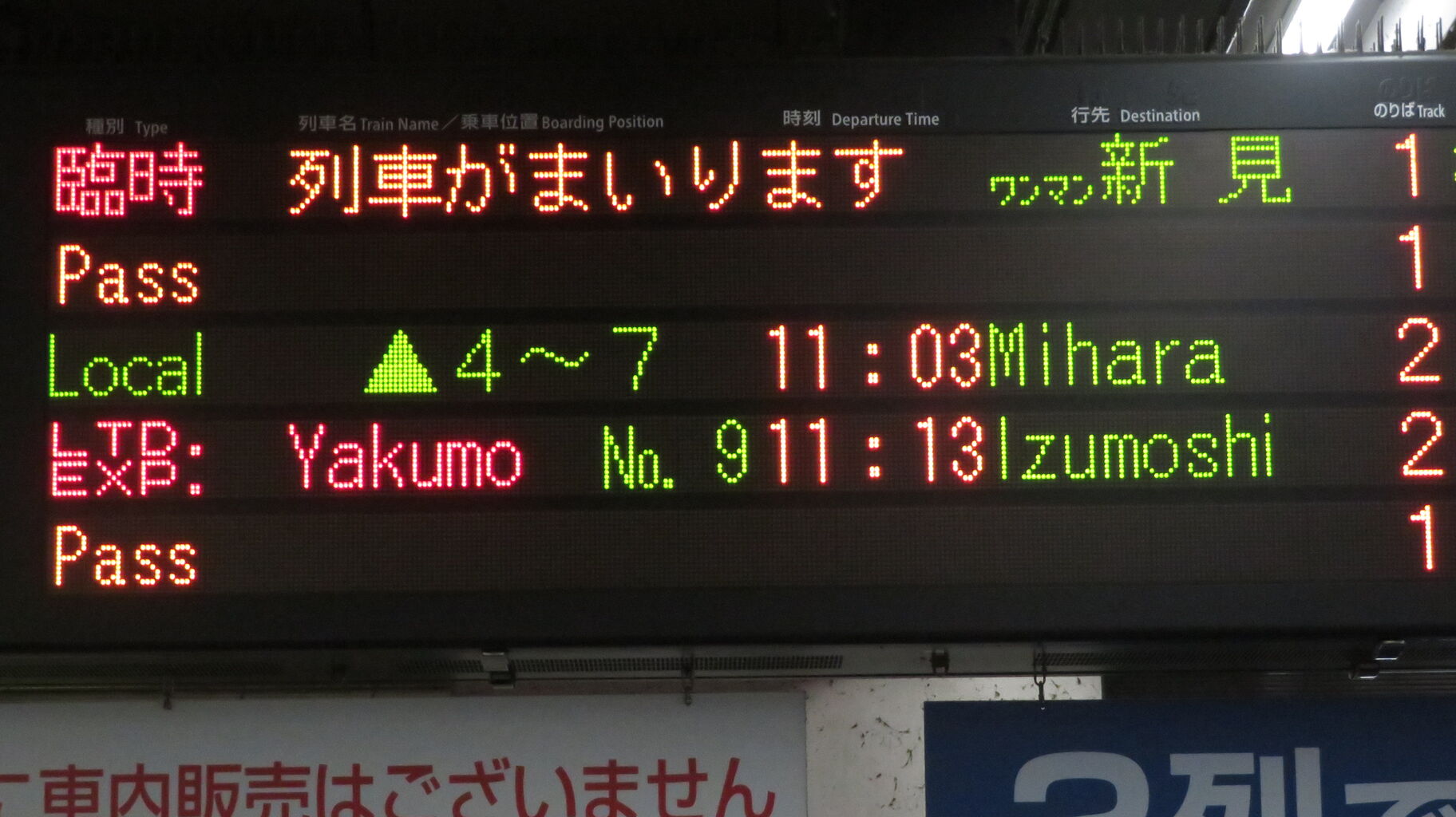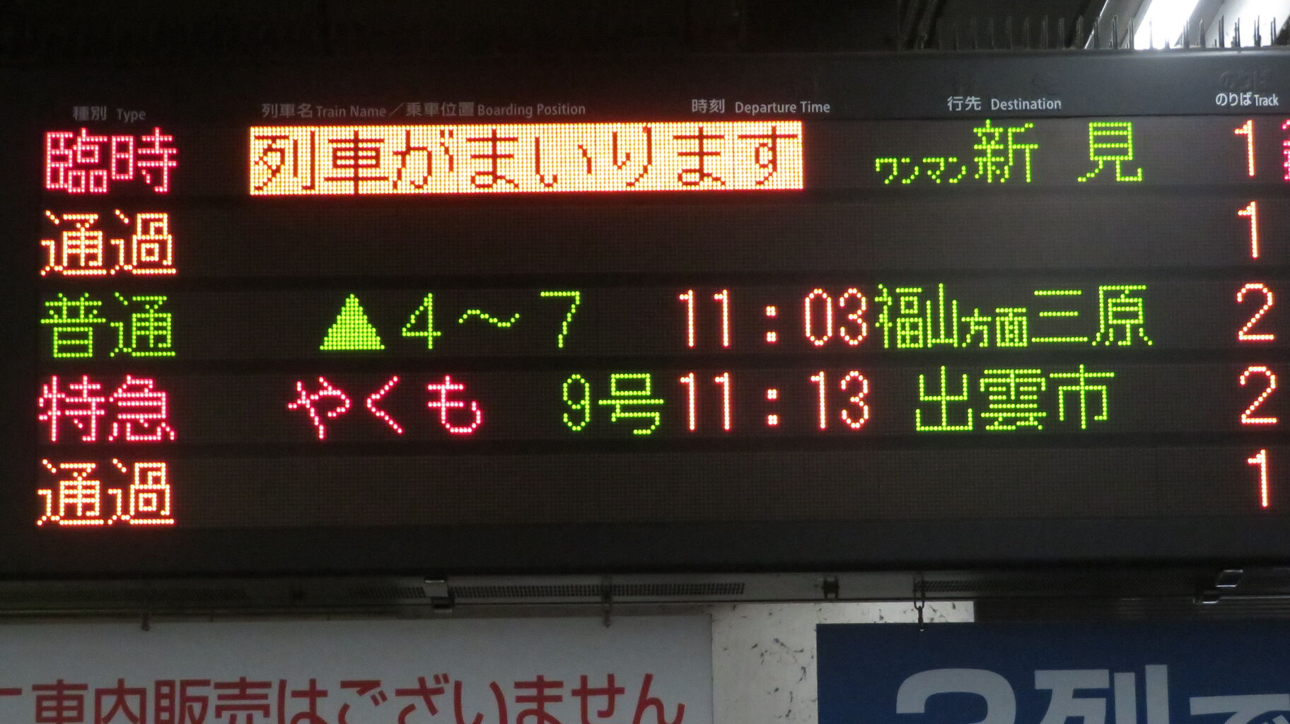 「列車がまいります」 表示を撮影。