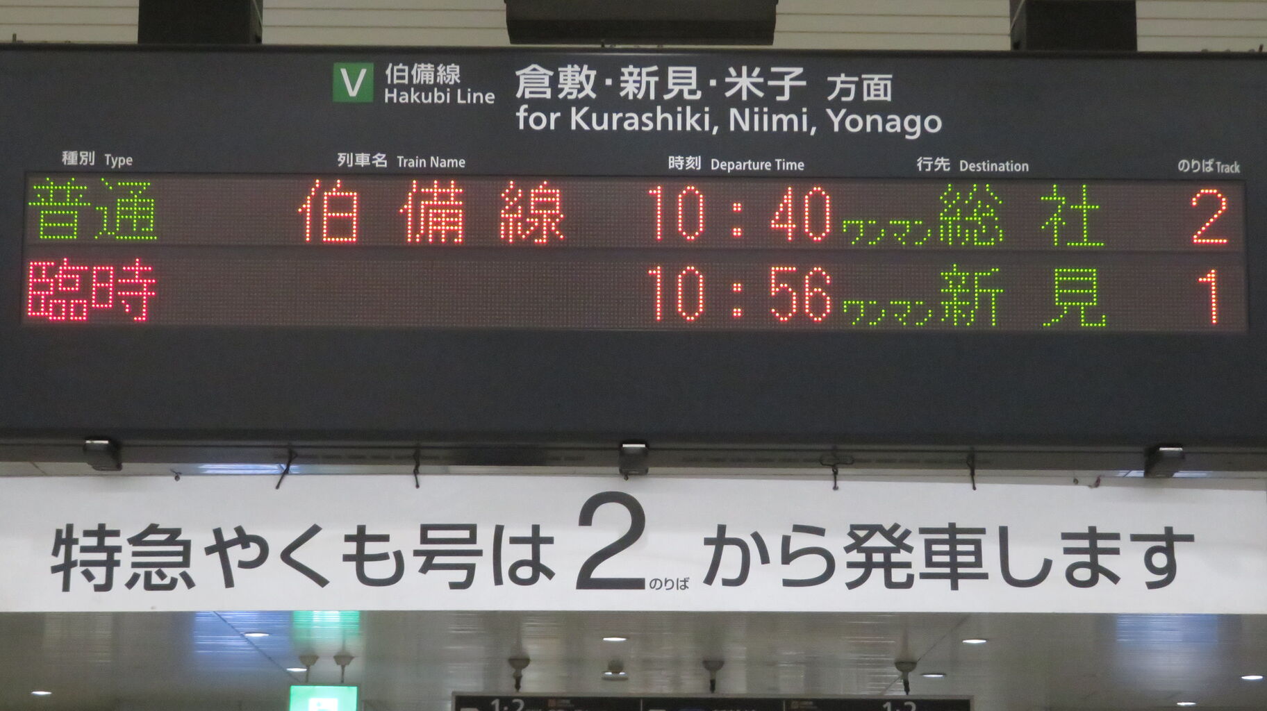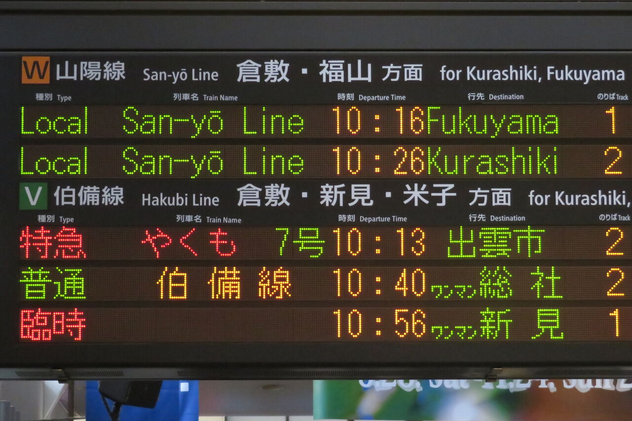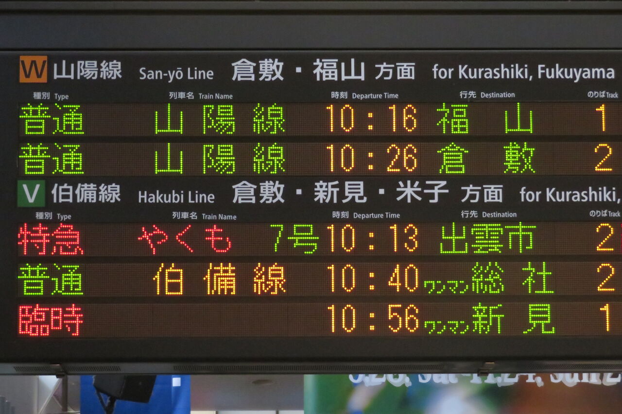 上から2段目に、普通 「倉敷行き」 が表示されています。