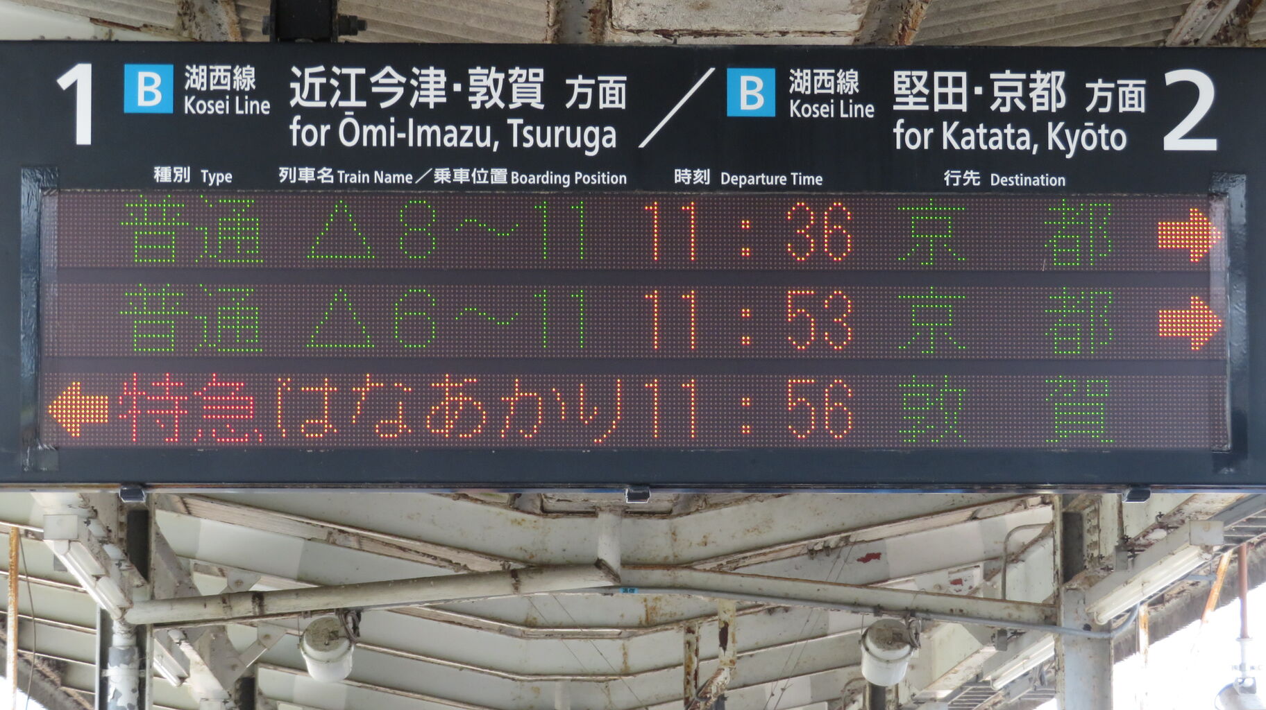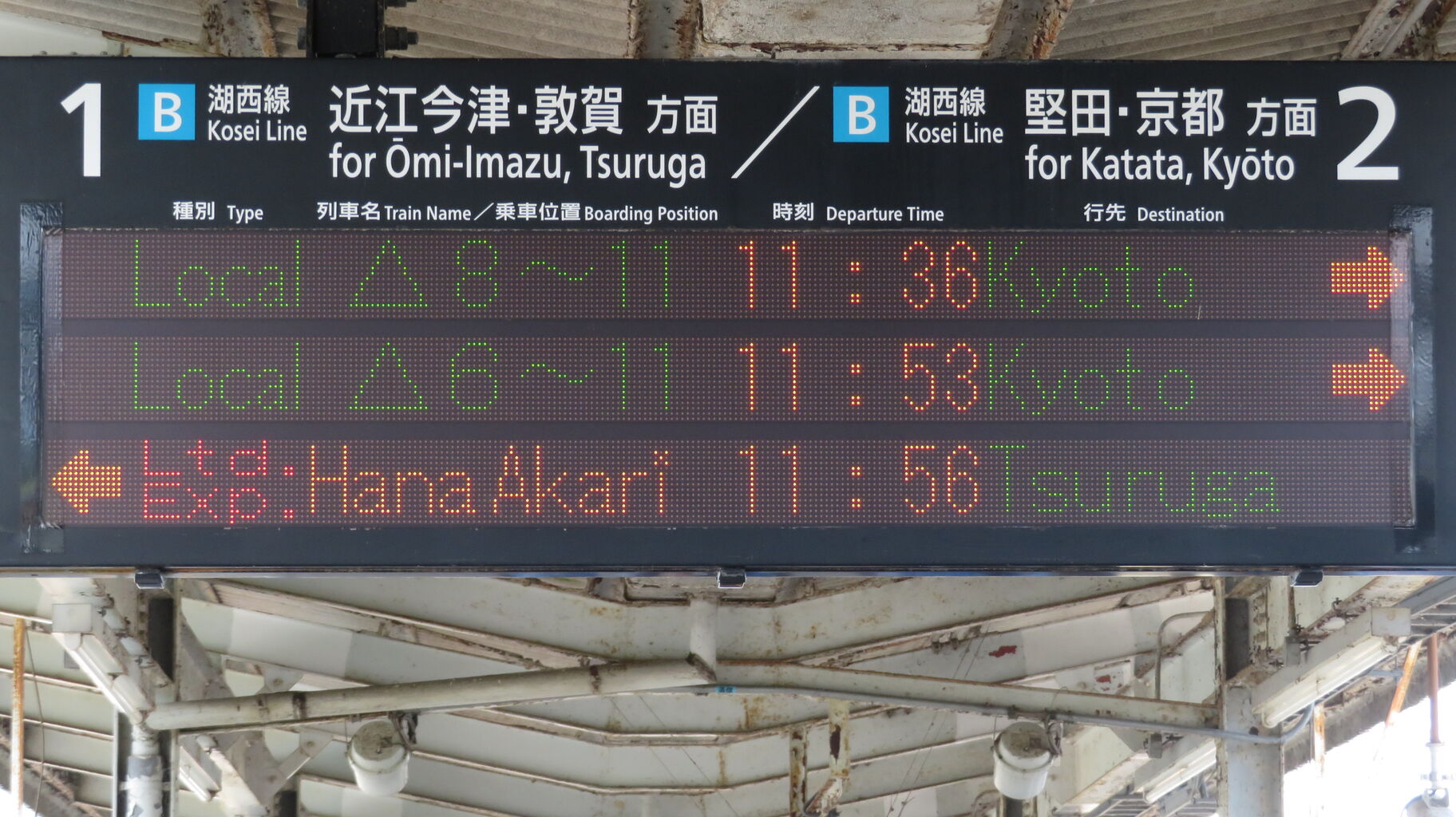 次に発車する京都方面・敦賀方面の列車が、左右どちらのホームから発車するかを示すものです。