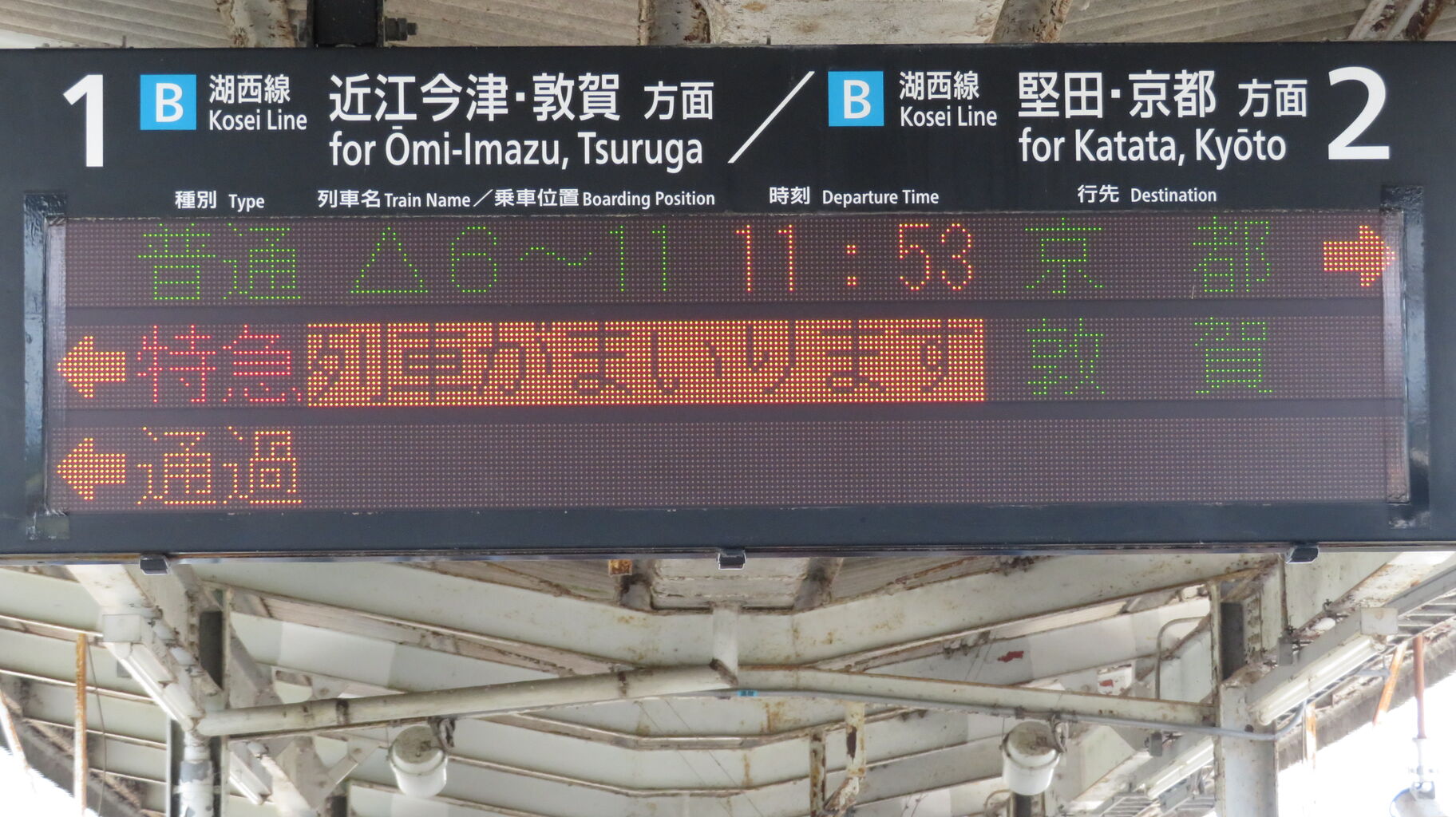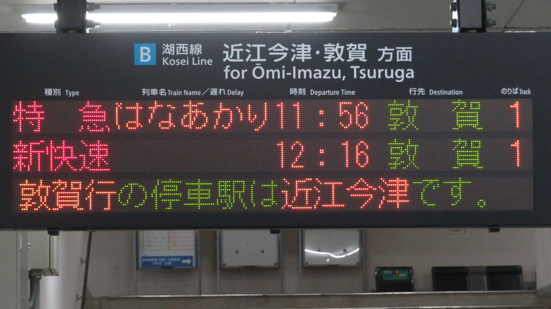 新快速・快速や普通電車の場合、敦賀方面は 「近江今津・敦賀方面」 と表示されます。