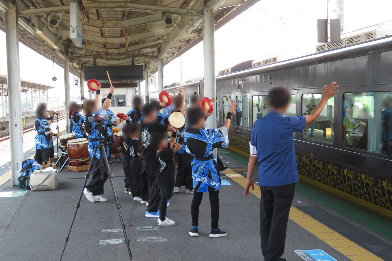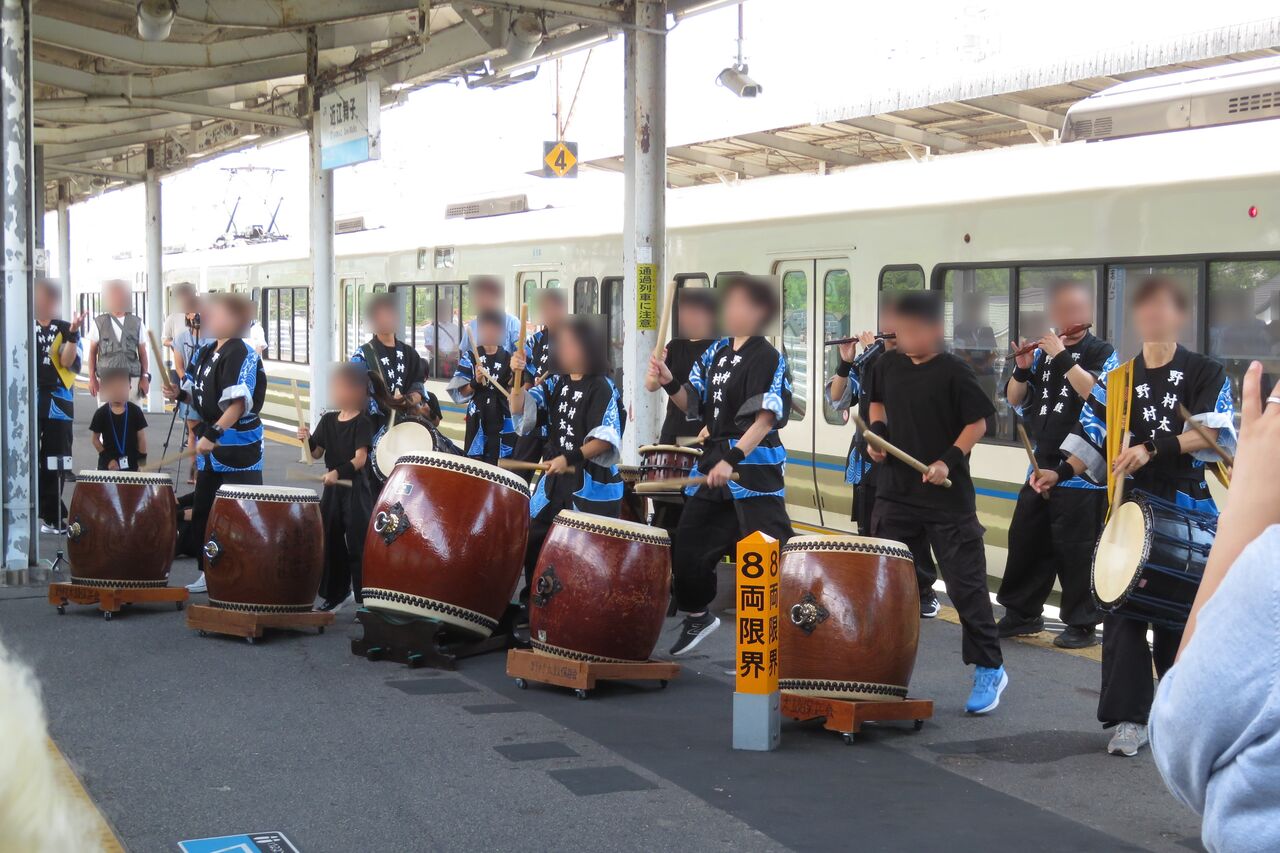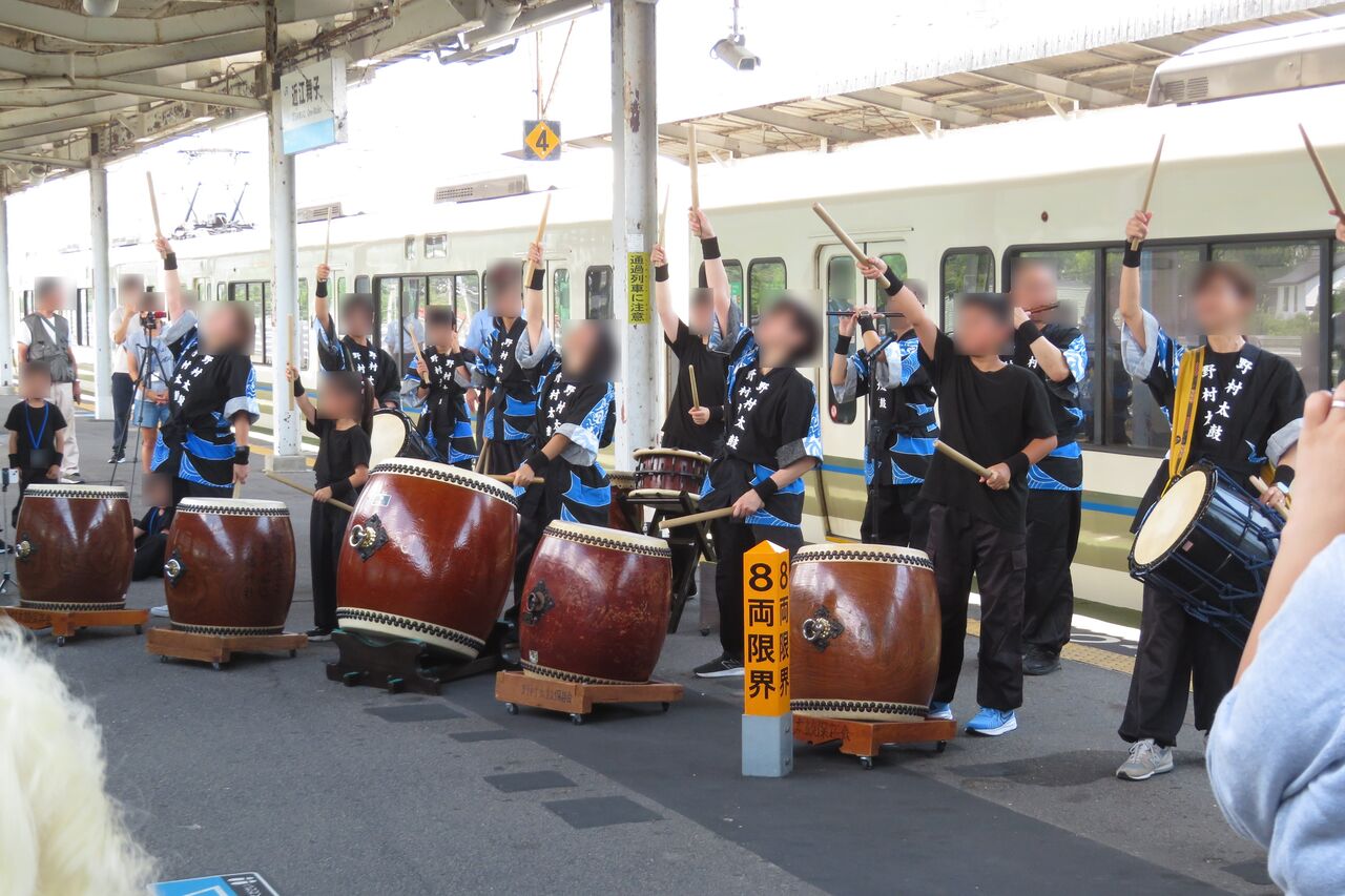ホームでは、和太鼓の演奏で はなあかりの乗客をもてなしていました。