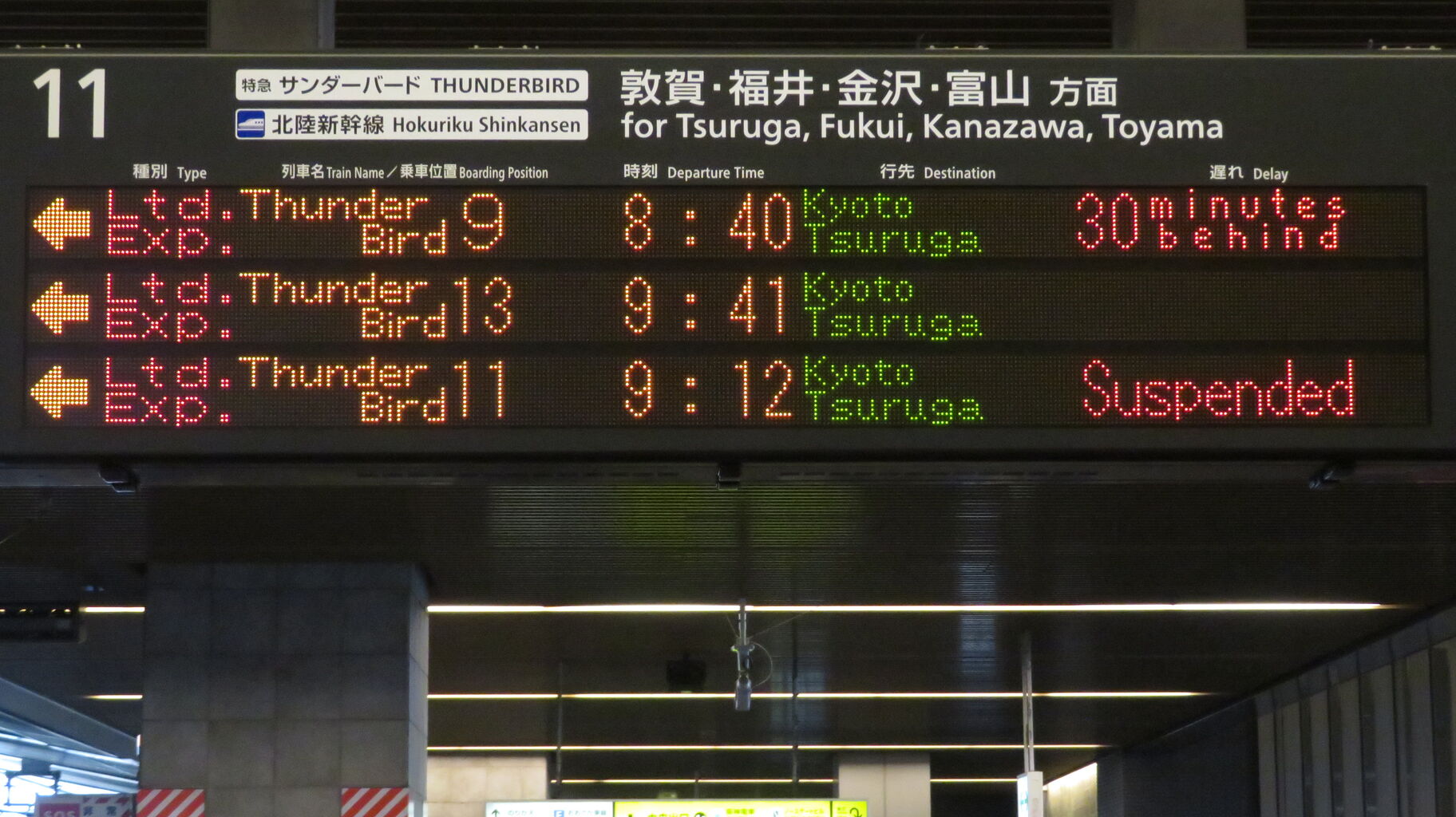LCD発車標や3色LED発車標ではオレンジ色でしたが、フルカラーLED発車標では 遅れ表示と同じく赤色で表示されます。