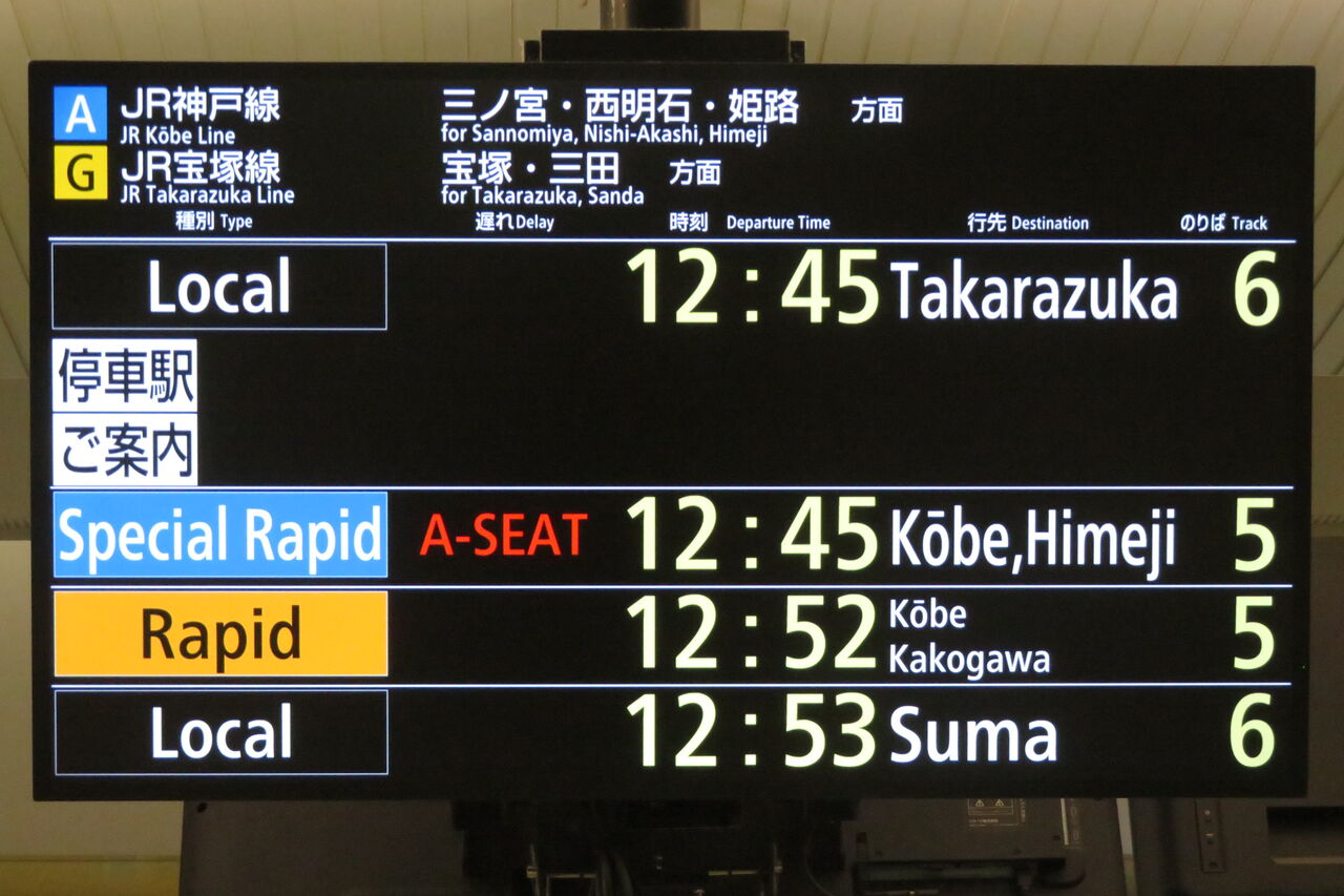大阪駅のJR京都線・神戸線ホームの発車標は、2024年になって、播州赤穂行きの表示が 「播州赤穂」 から 「姫路方面 播州赤穂」 になったりするなど、行き先表示が一部変化しています。