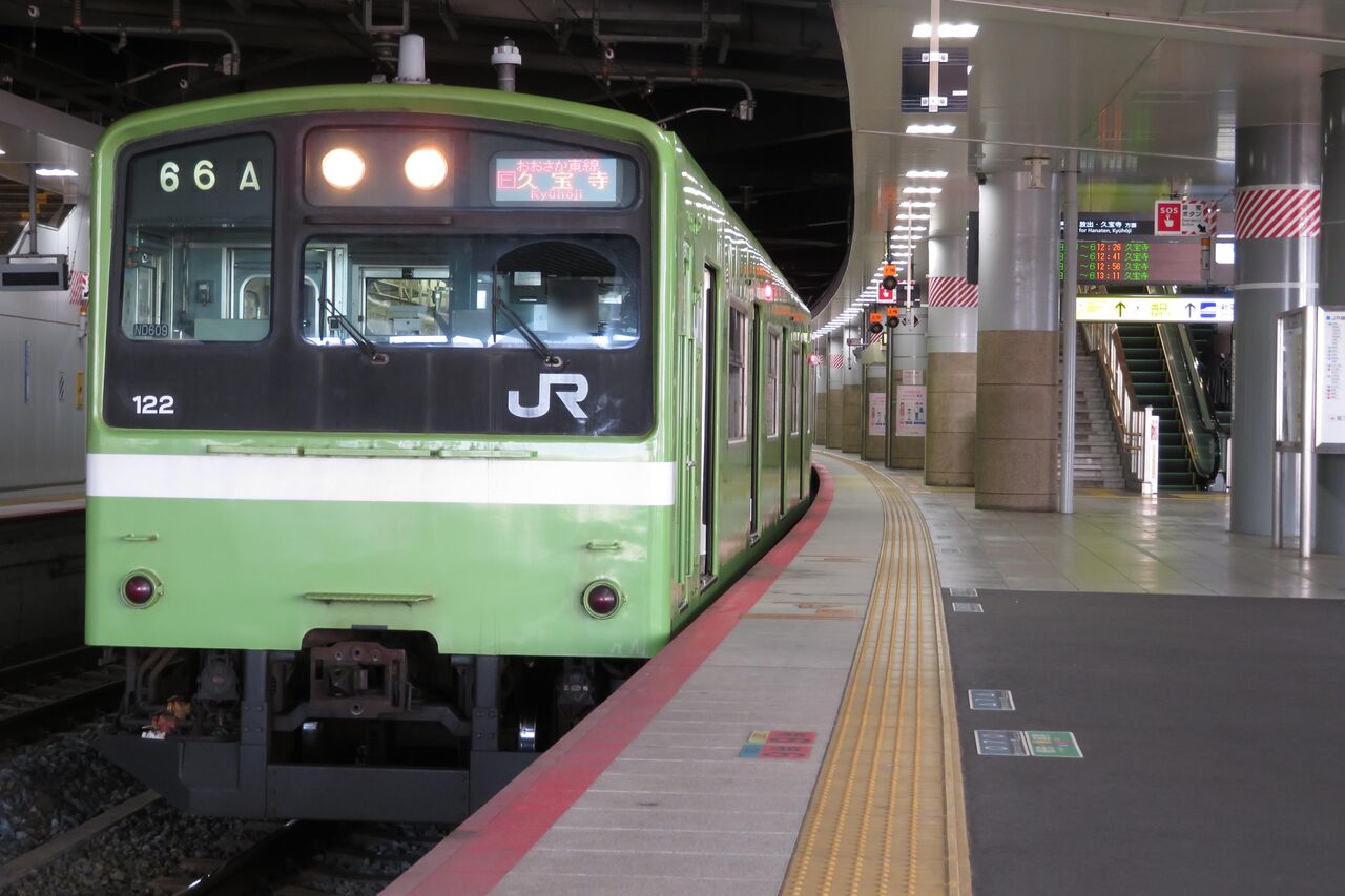 ※新大阪駅に停車中の普通 久宝寺行き。国鉄車両の201系です。(2022年2月撮影)