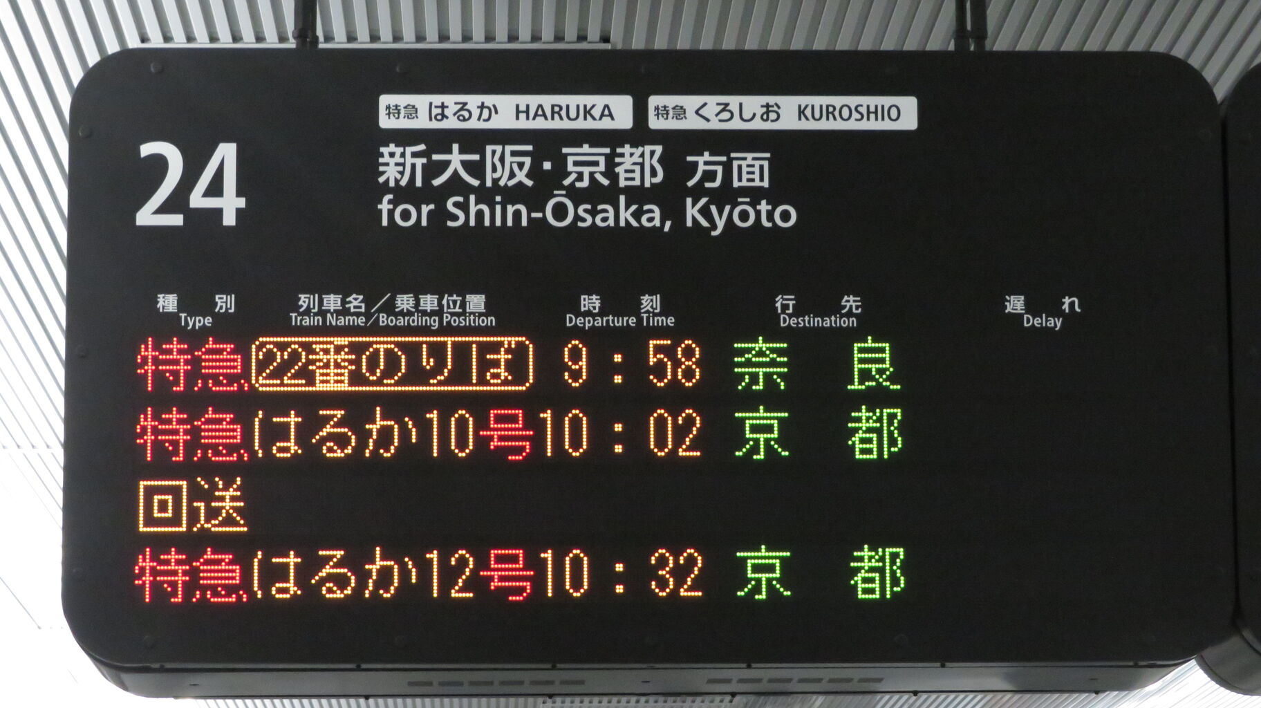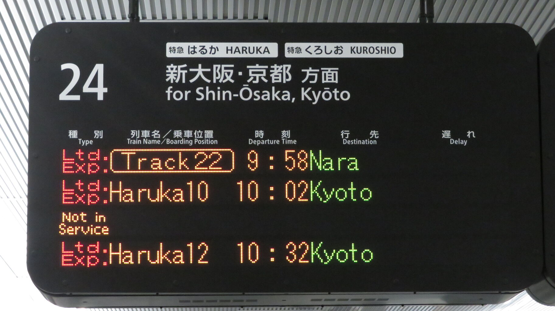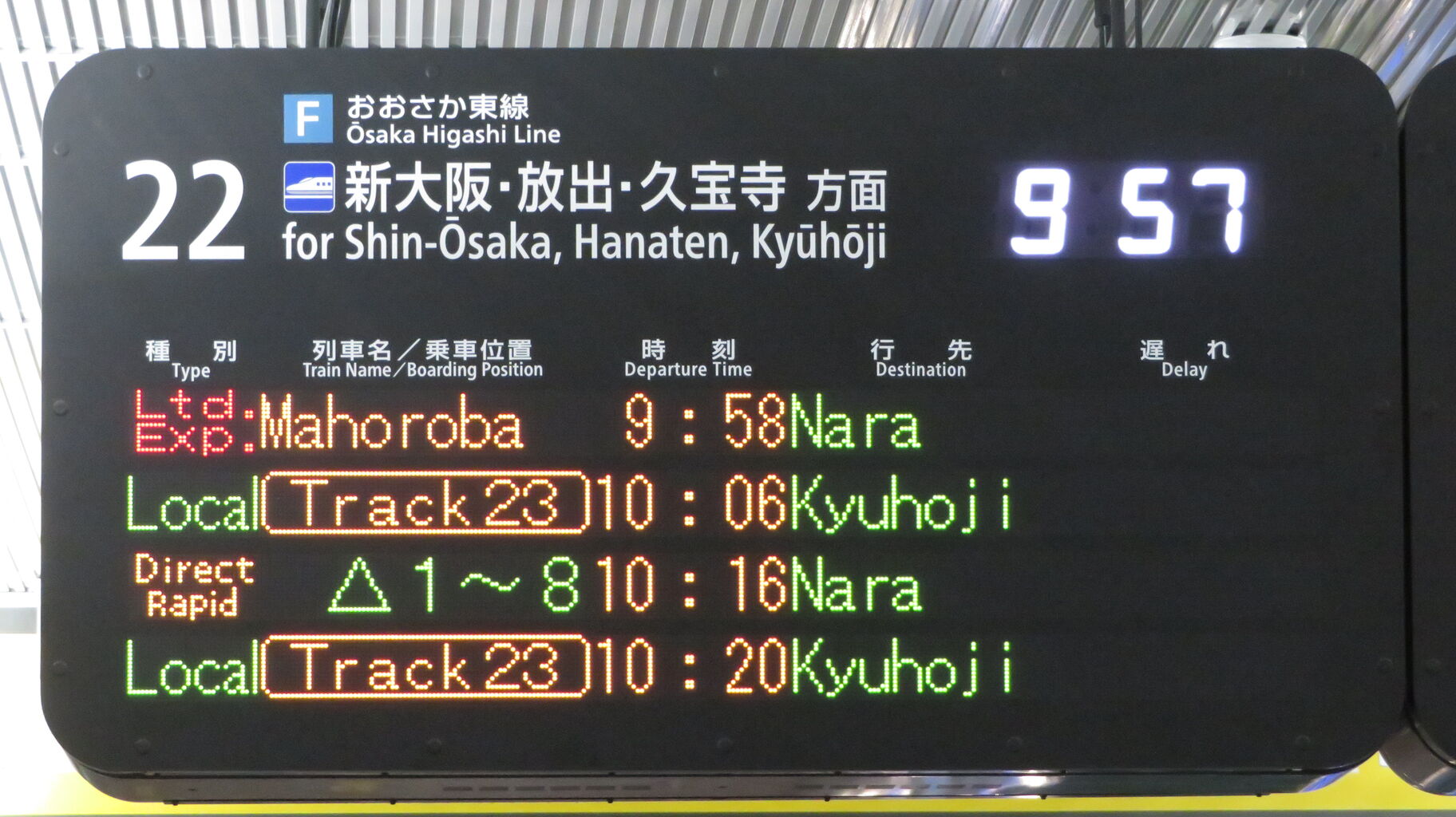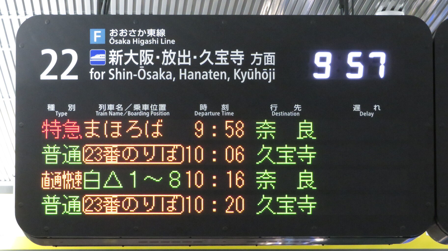そのため、まほろば号の発車案内は おおさか東線の発車標ではなく、京都方面へ向かう特急列車の発車標に表示されていました。