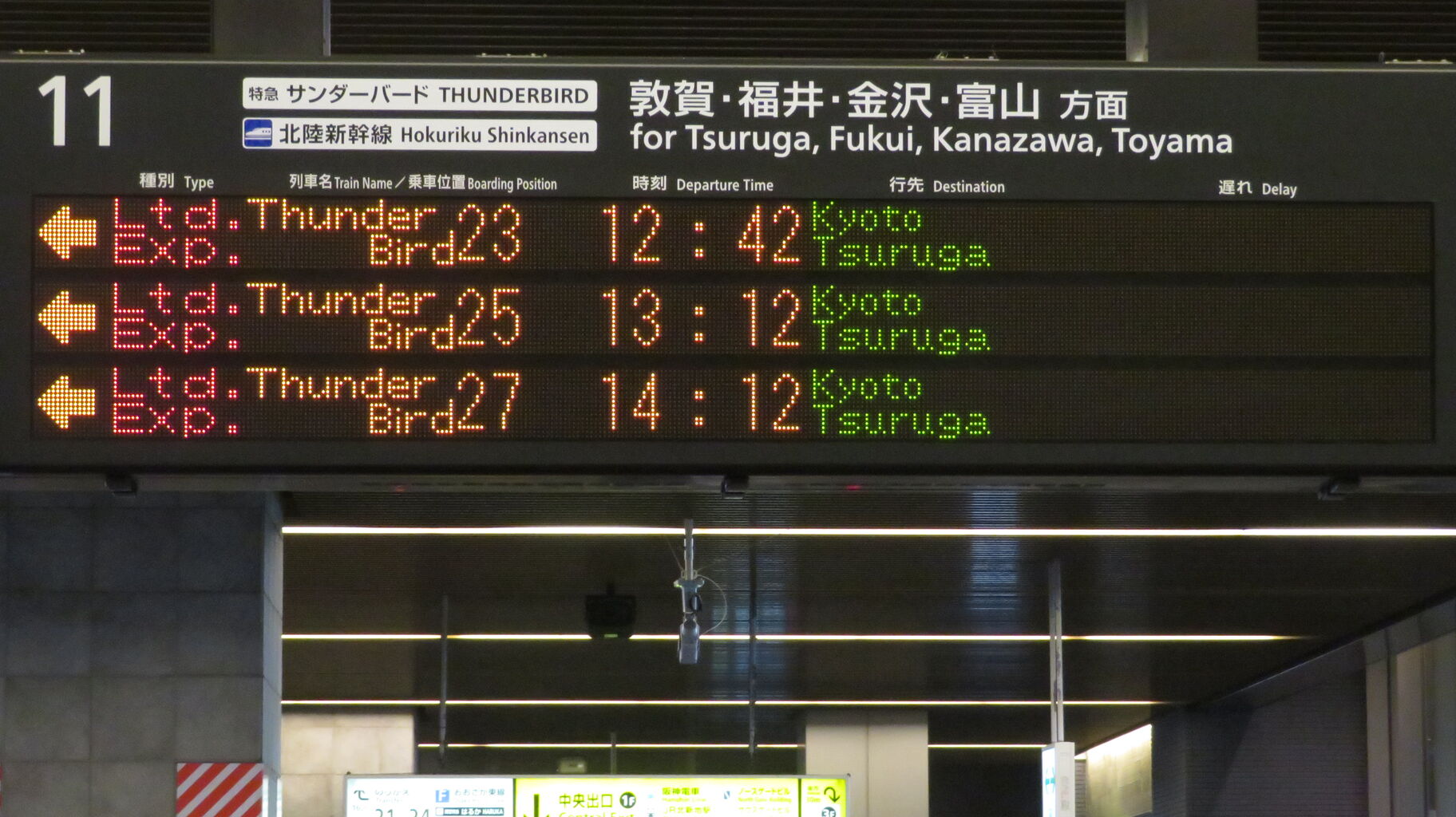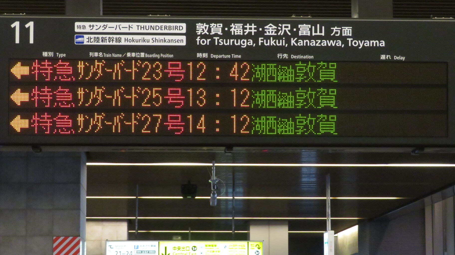 11番のりばに特急サンダーバードが停車していましたが、発車標に 『停車中』 表示は出ませんでした。