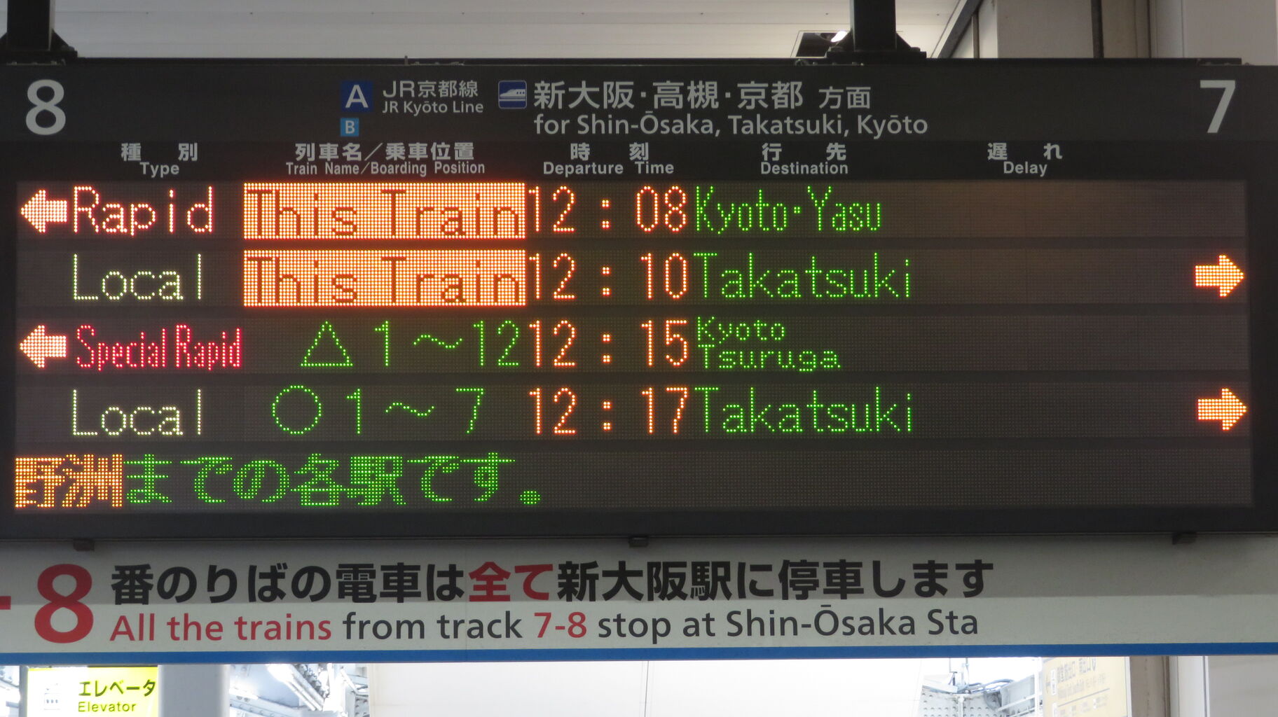 まずは、7・8番のりば(JR京都線ホーム)の発車標から。