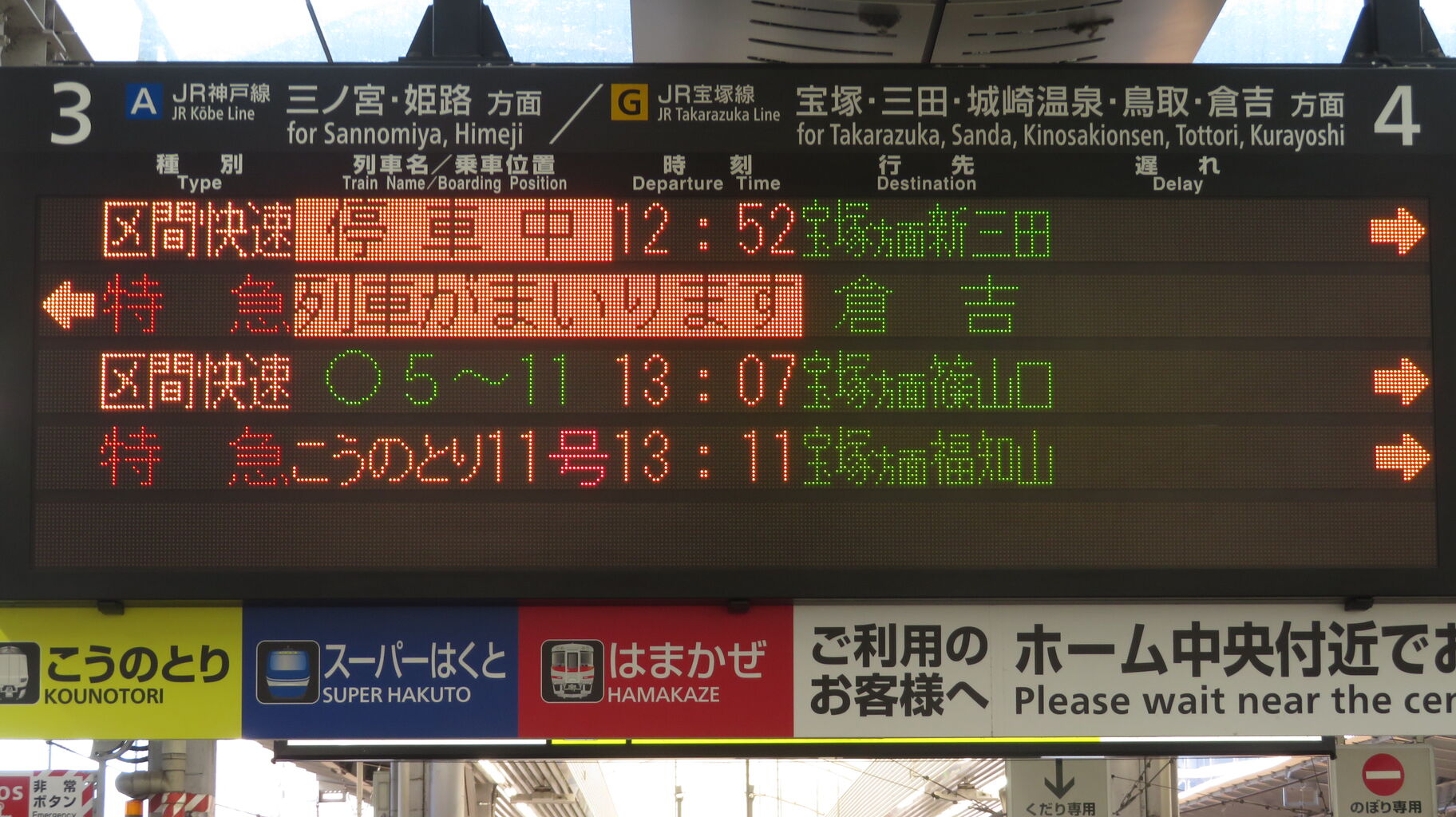 JR宝塚線の区間快速 新三田行きにも、『停車中』 表示が出ていました。