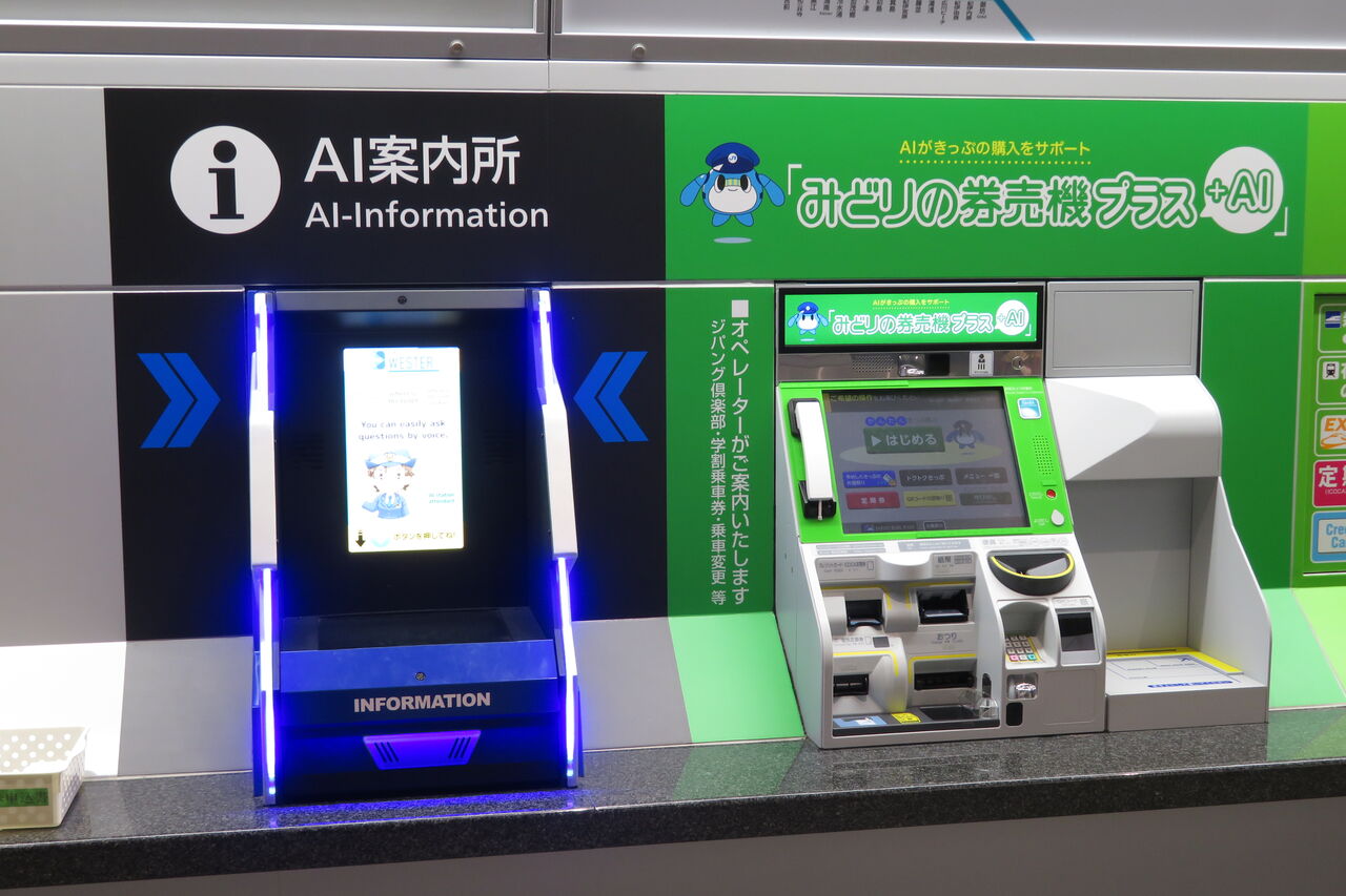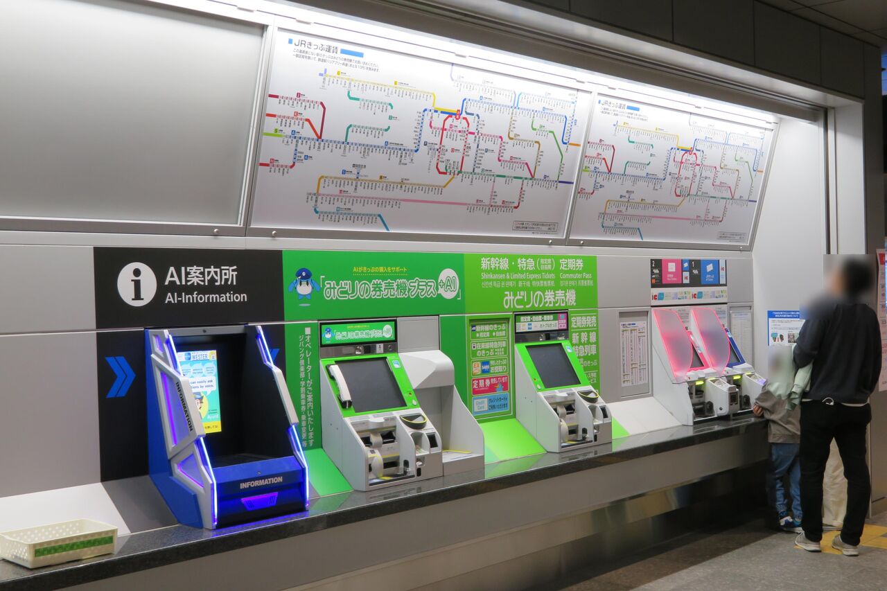 自動きっぷうりばには、通常の自動券売機と みどりの券売機のほか、みどりの券売機プラスとAI案内所が設置されています。