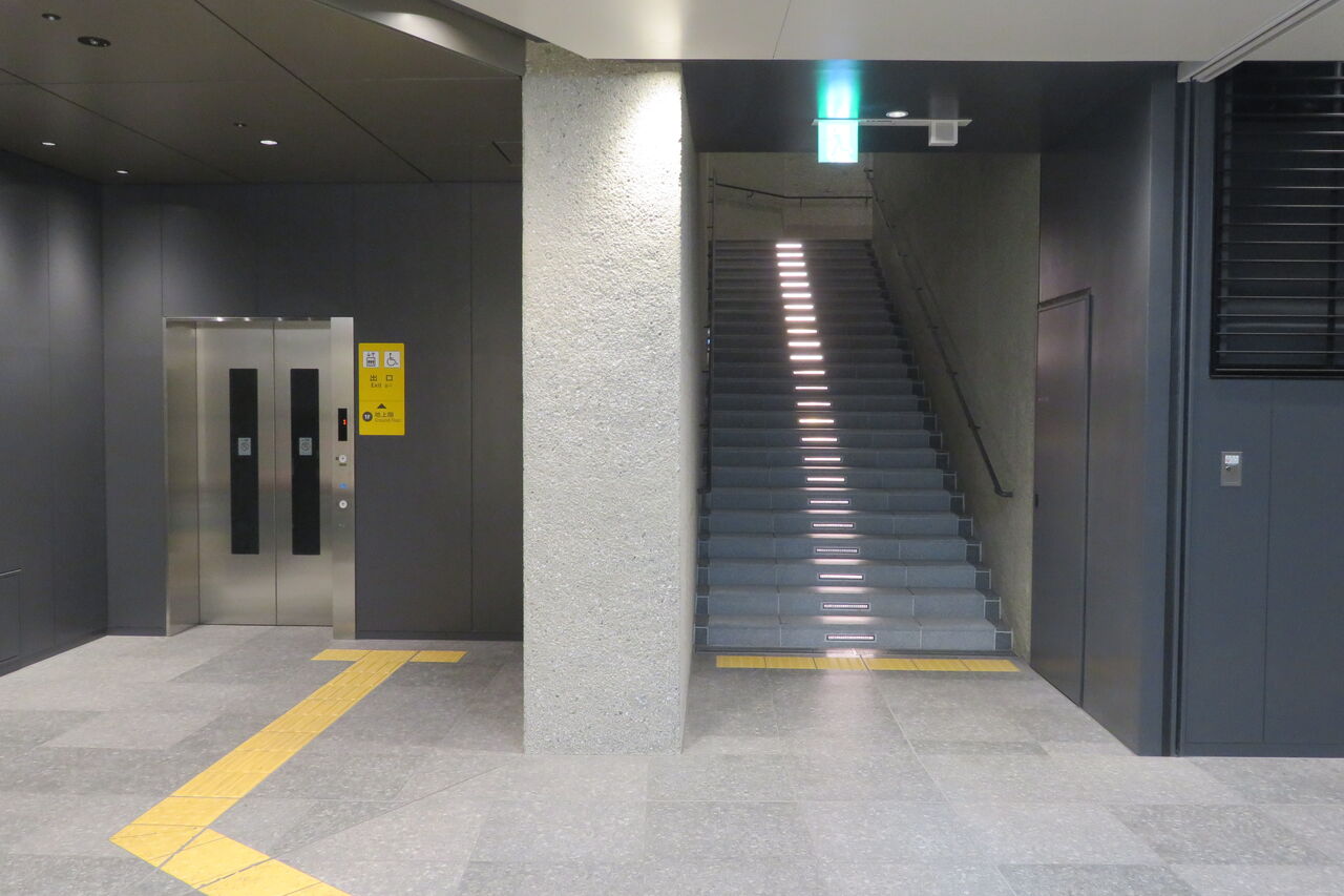グランフロント大阪へと続く通路の手前に、外につながるエレベーターと階段があります。