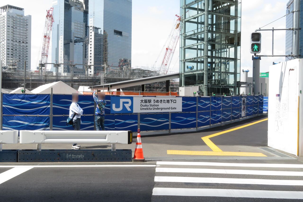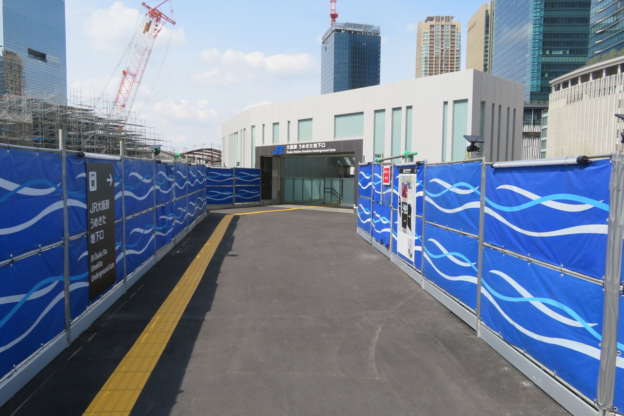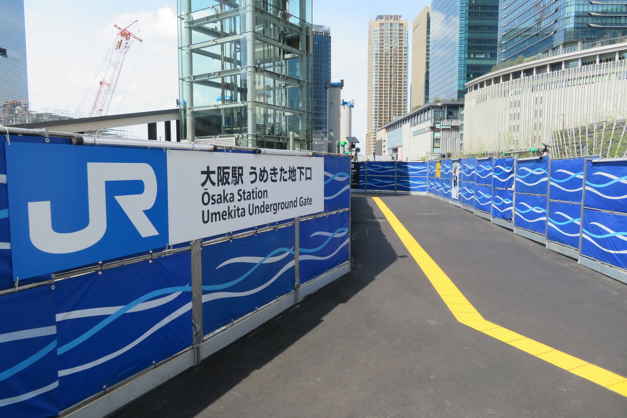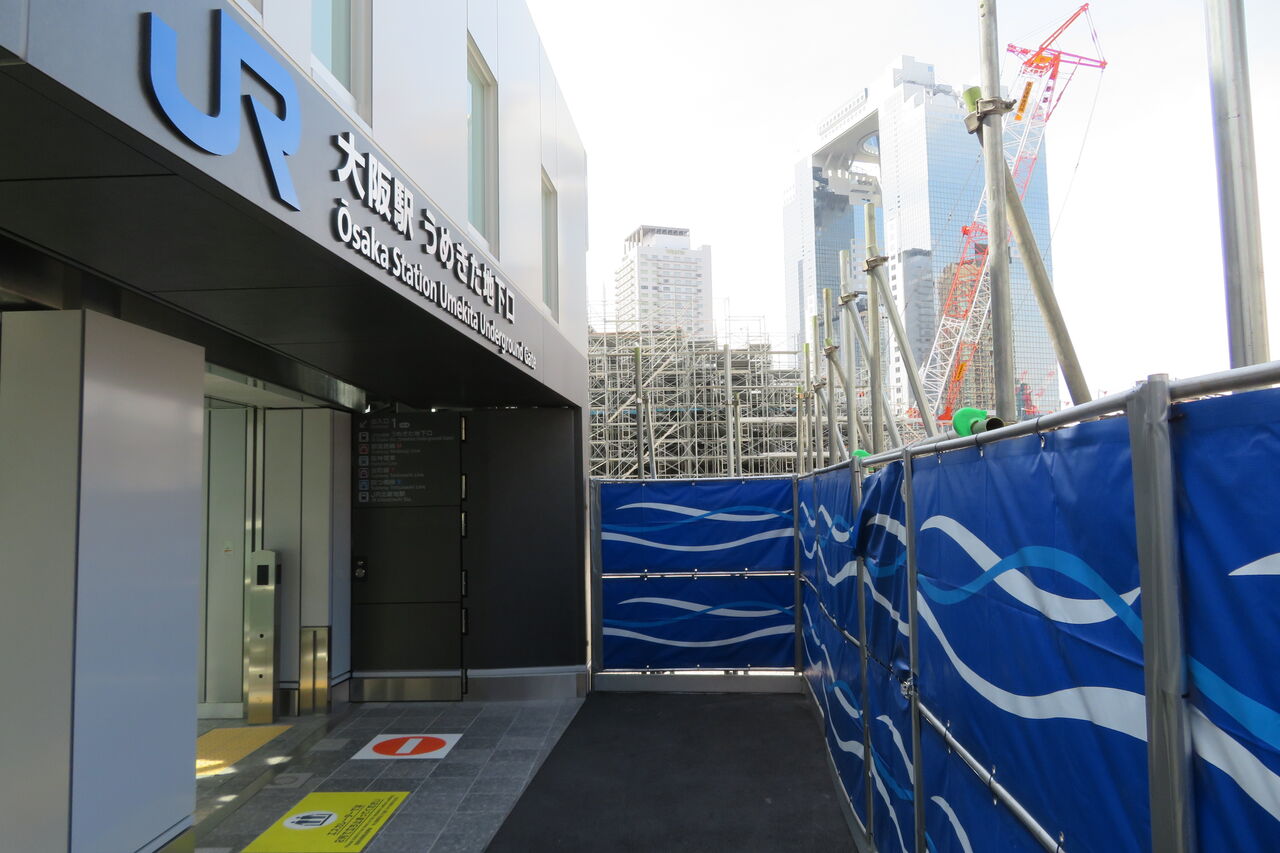 うめきた地下口の駅舎は、再開発の工事エリアに囲まれています。