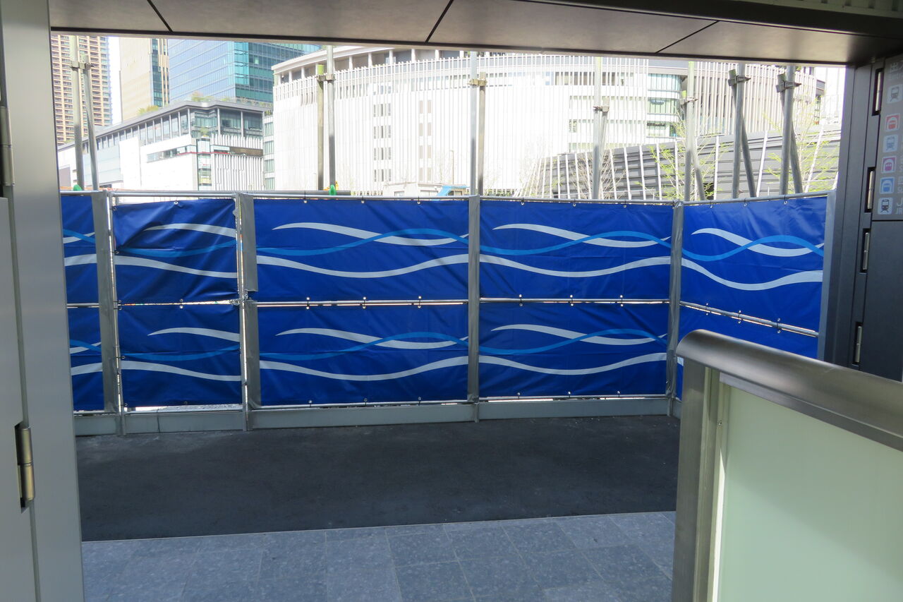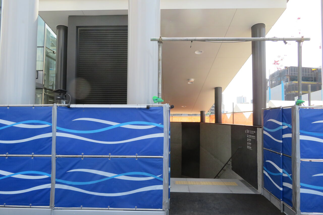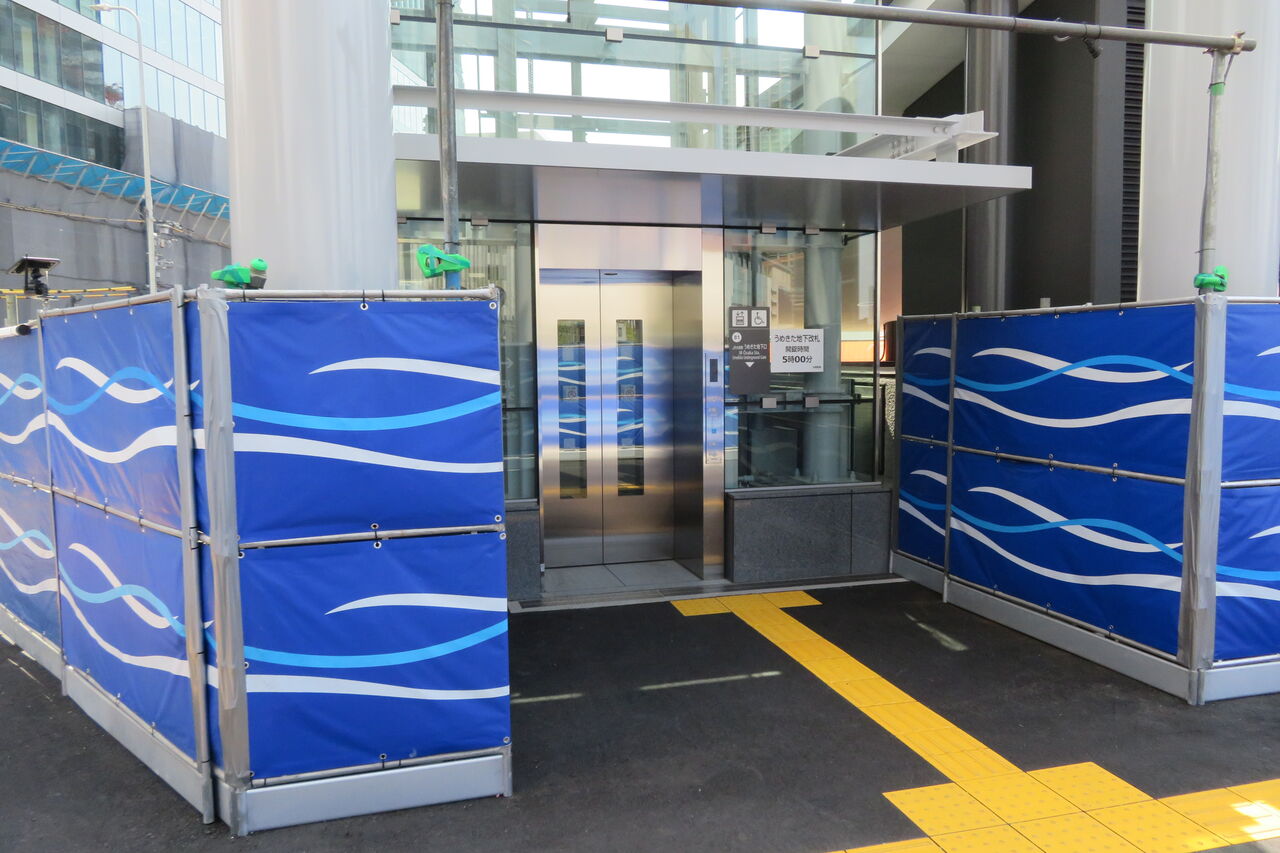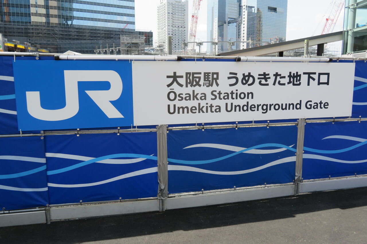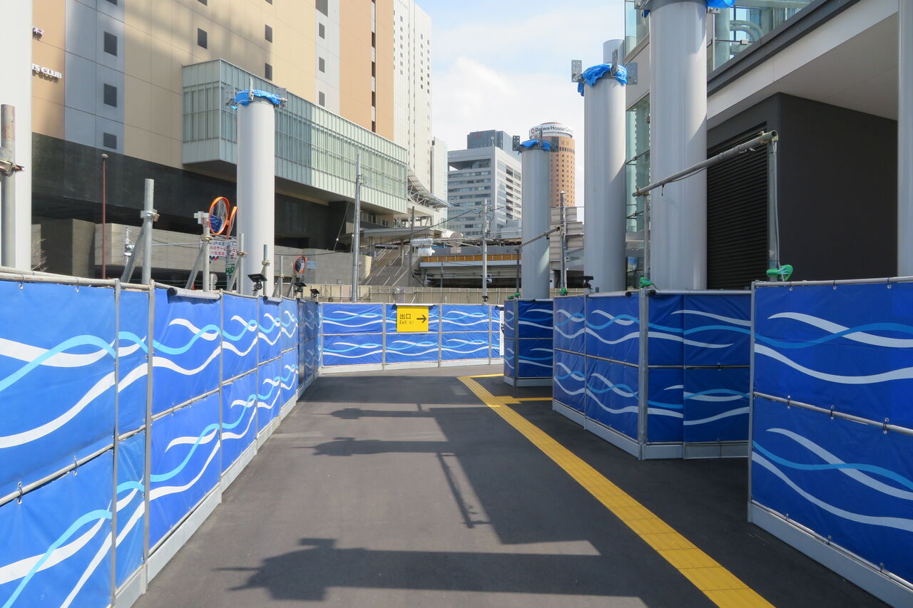 うめきた地下口の駅舎は、再開発の工事エリアに囲まれています。