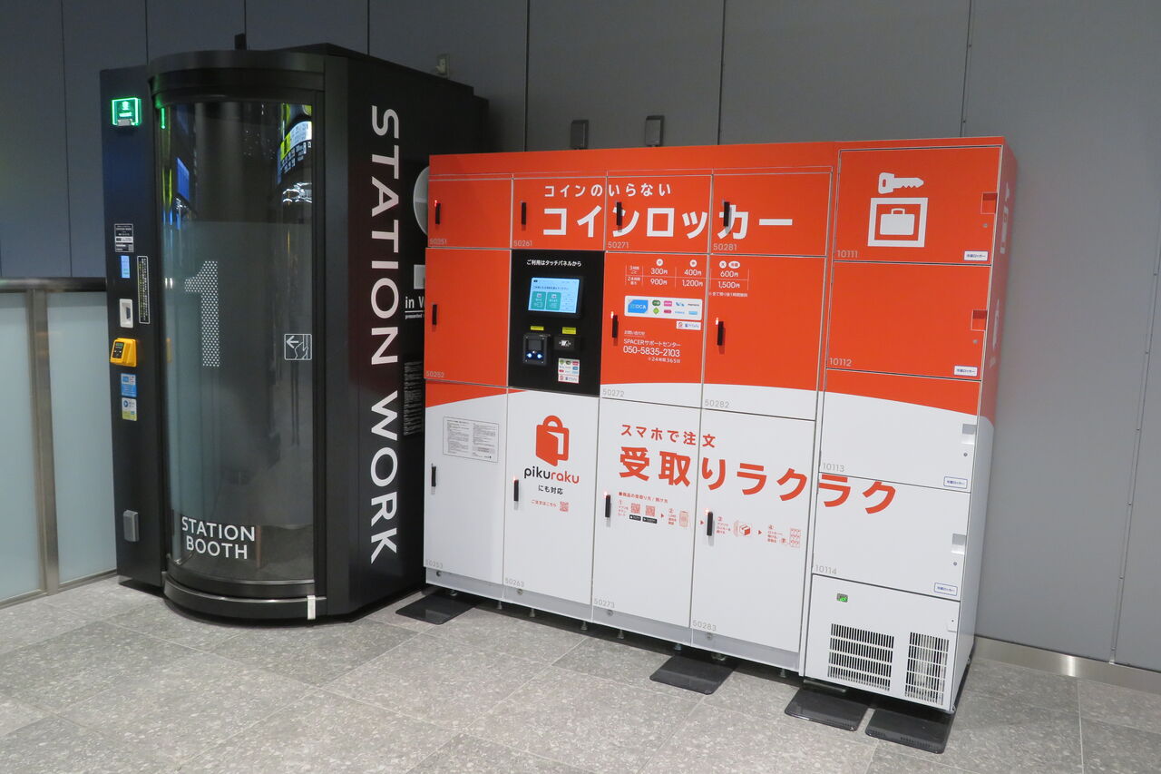 顔認証改札機の右側のスペースには、コインロッカーと 1人用個室ブース 「STATION BOOTH」 が設置されています。