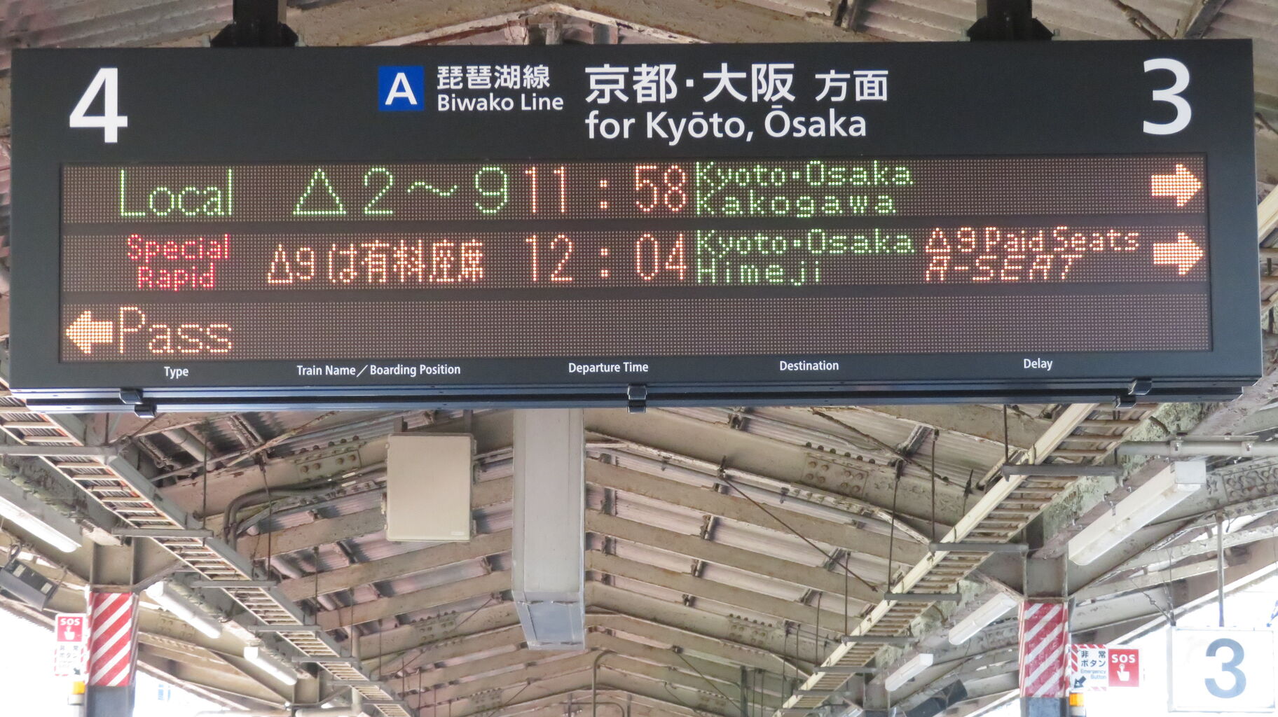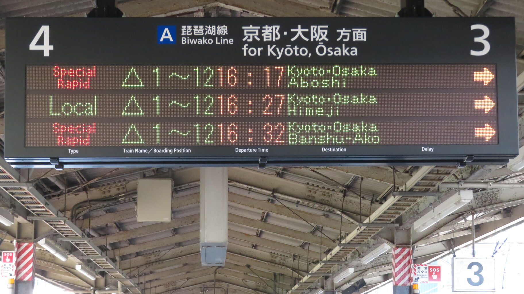 続いて、3・4番のりば(京都・大阪方面ホーム)に設置されている発車標をご紹介。