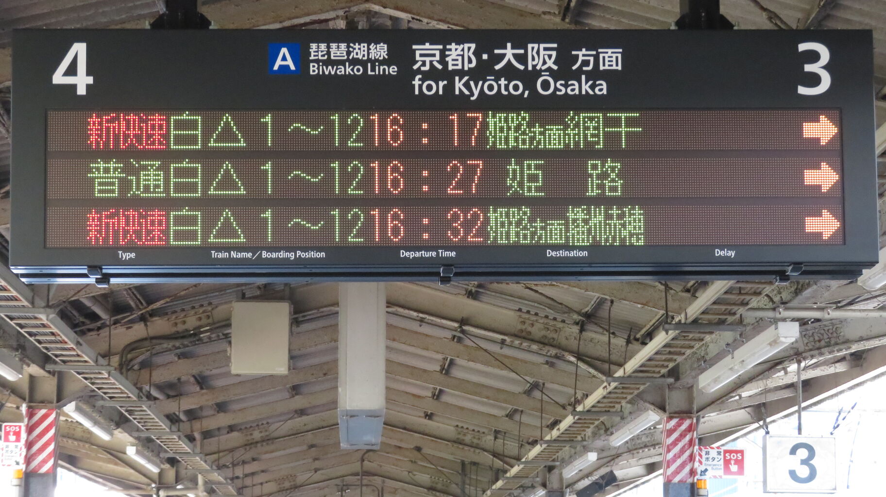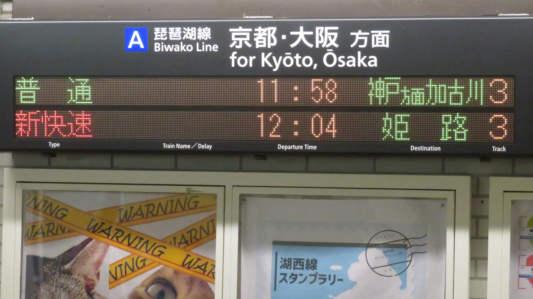 以上、大津駅のホーム・改札口に設置されている発車標を紹介しました。