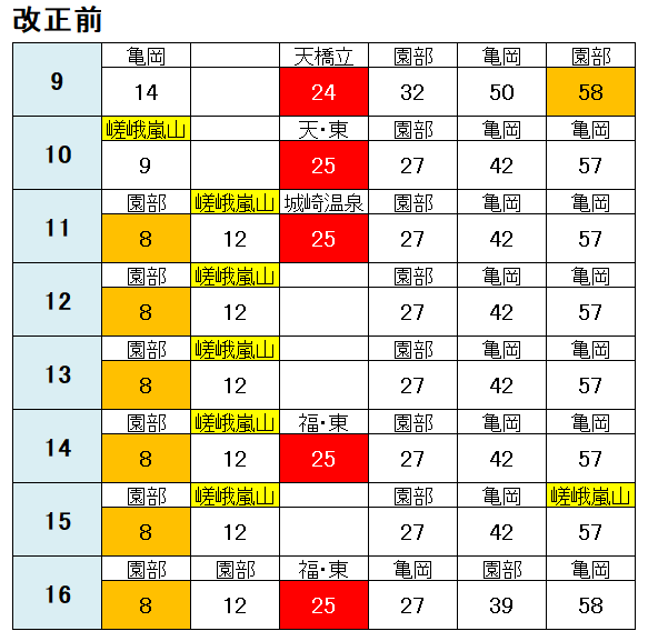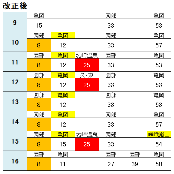 嵯峨嵐山行きのほとんどが 亀岡行きに変更され、毎時3本・概ね20分間隔での運行に変わっています。