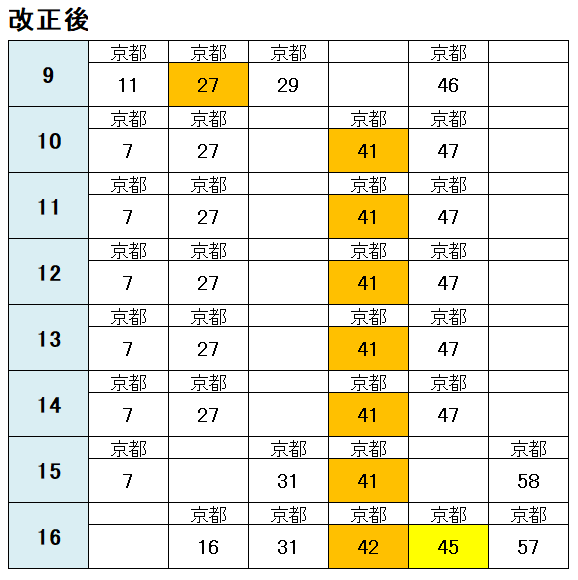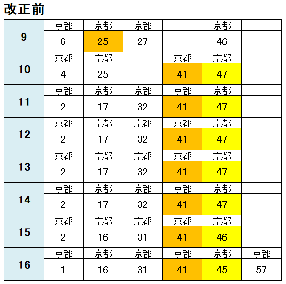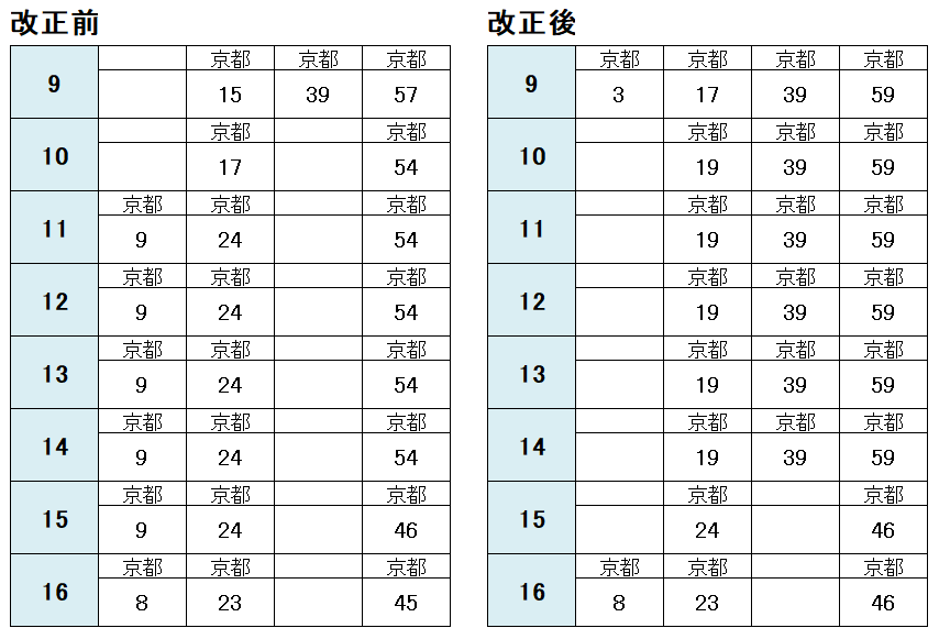 京都方面の時刻表も新旧比較しました。