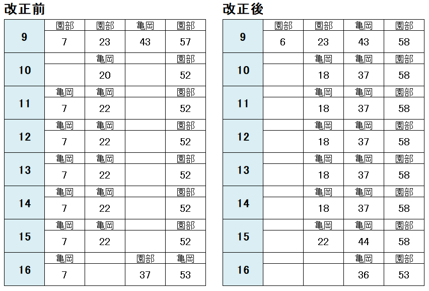 改正前は 10時17分発の次が10時54分発と 運転間隔が37分も開いていましたが、改正後は 10時台も20分間隔となり 改善されています。