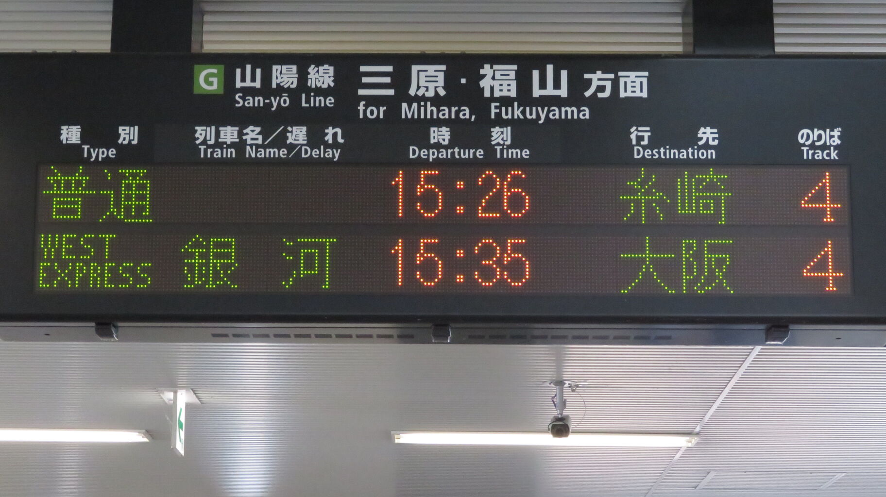 普通 糸崎行きが発車し、銀河の発車案内が上の段に表示されました。