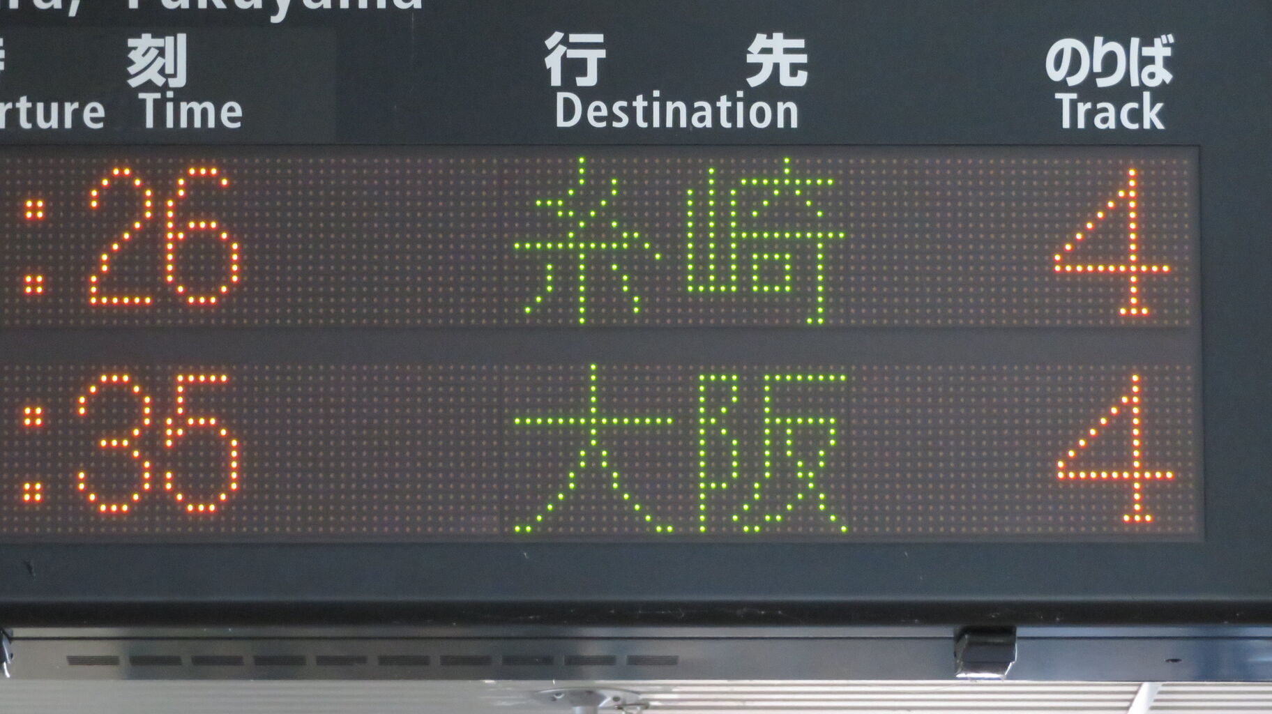 糸崎行きの発車後、上の段から順番に表示が切り替わったため、銀河の大阪行きが2つ表示されているところを撮ることもできました。