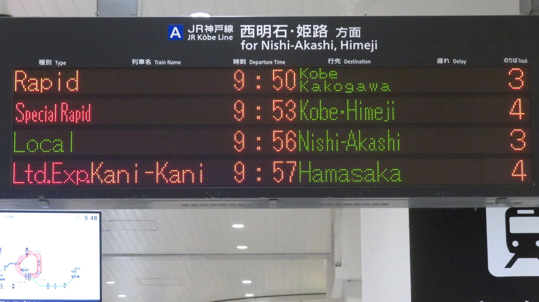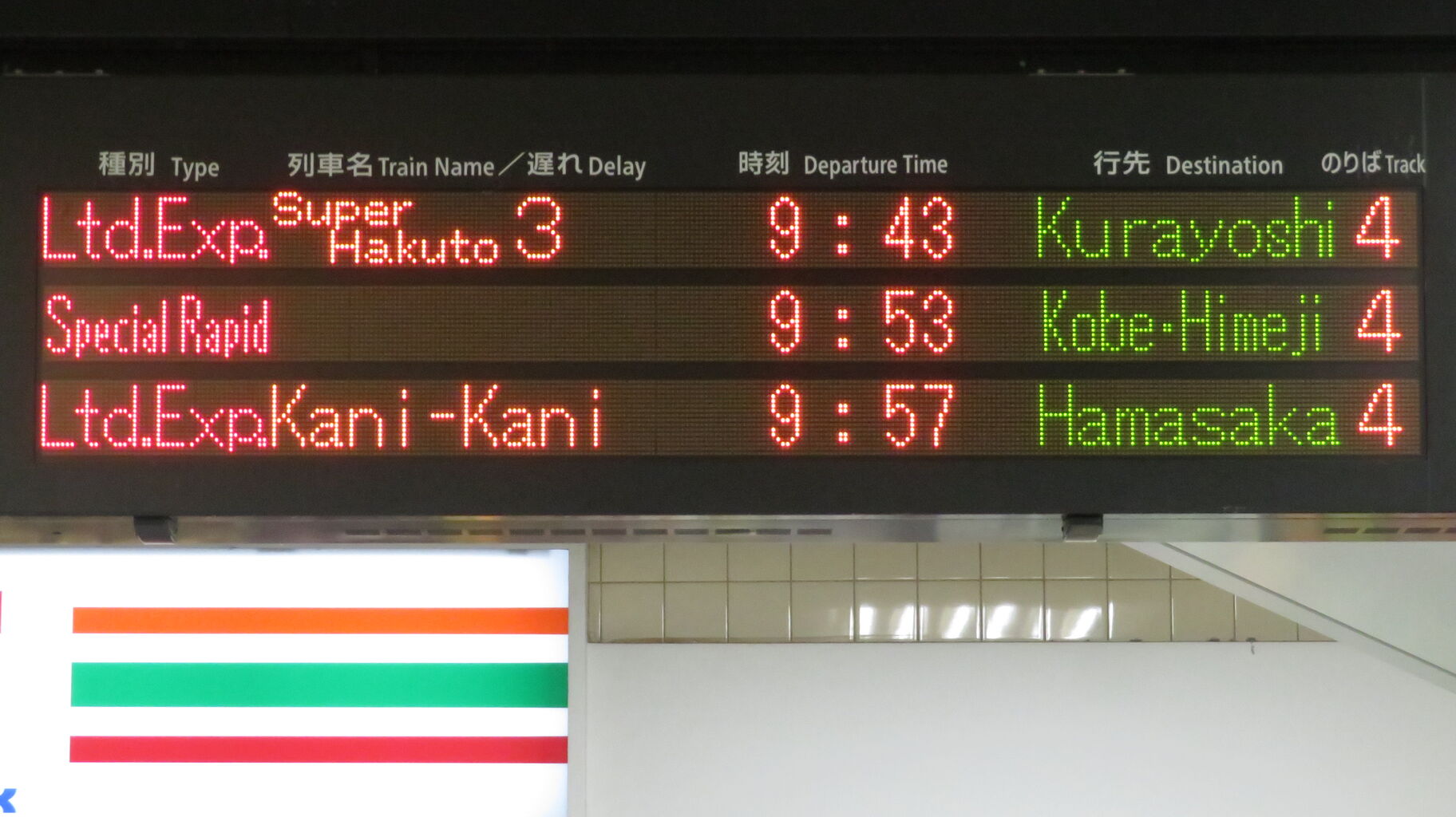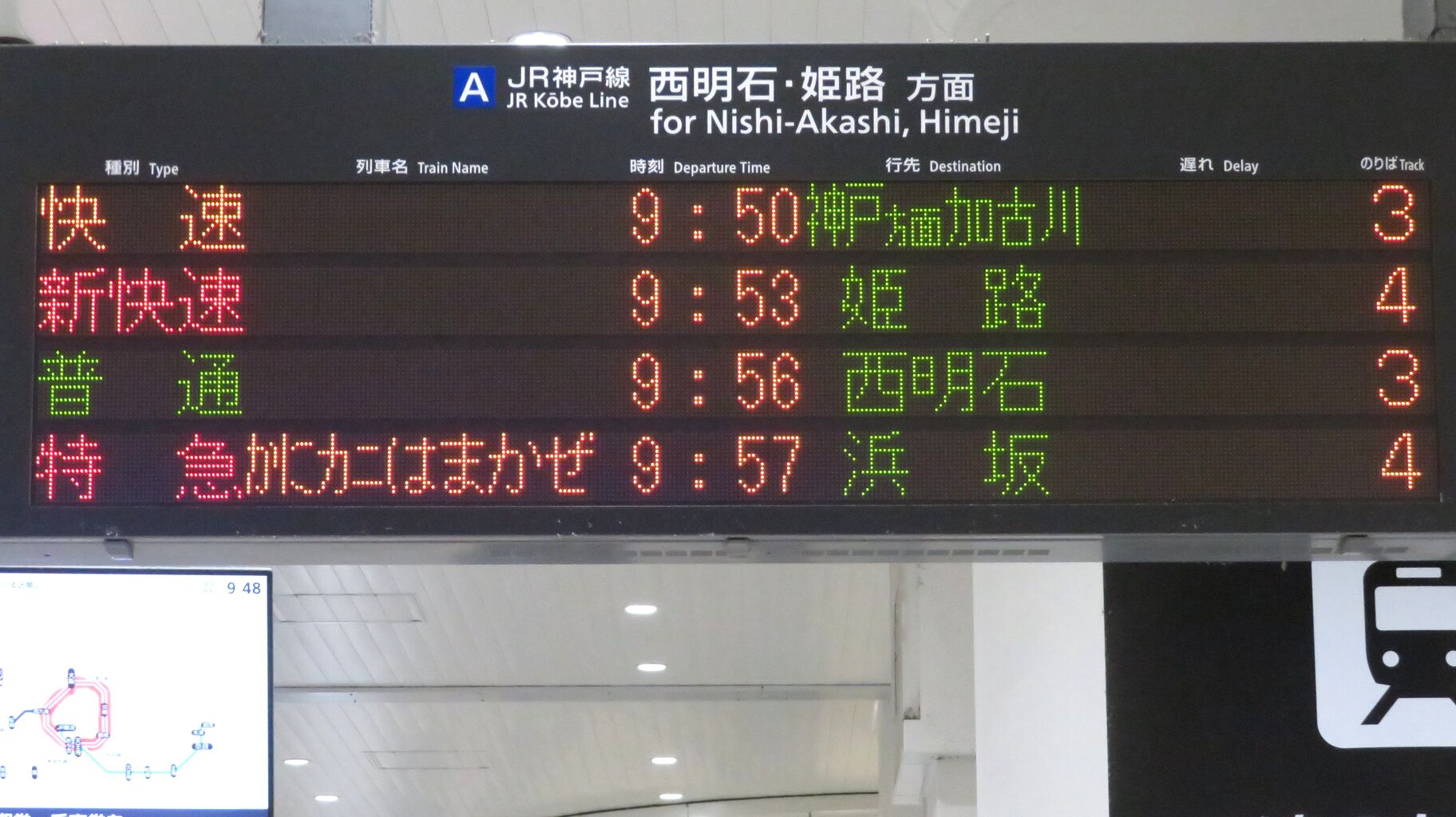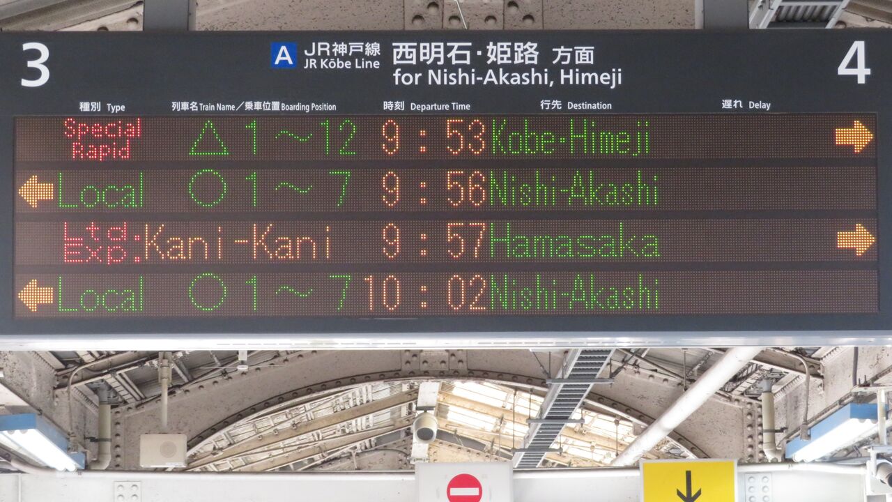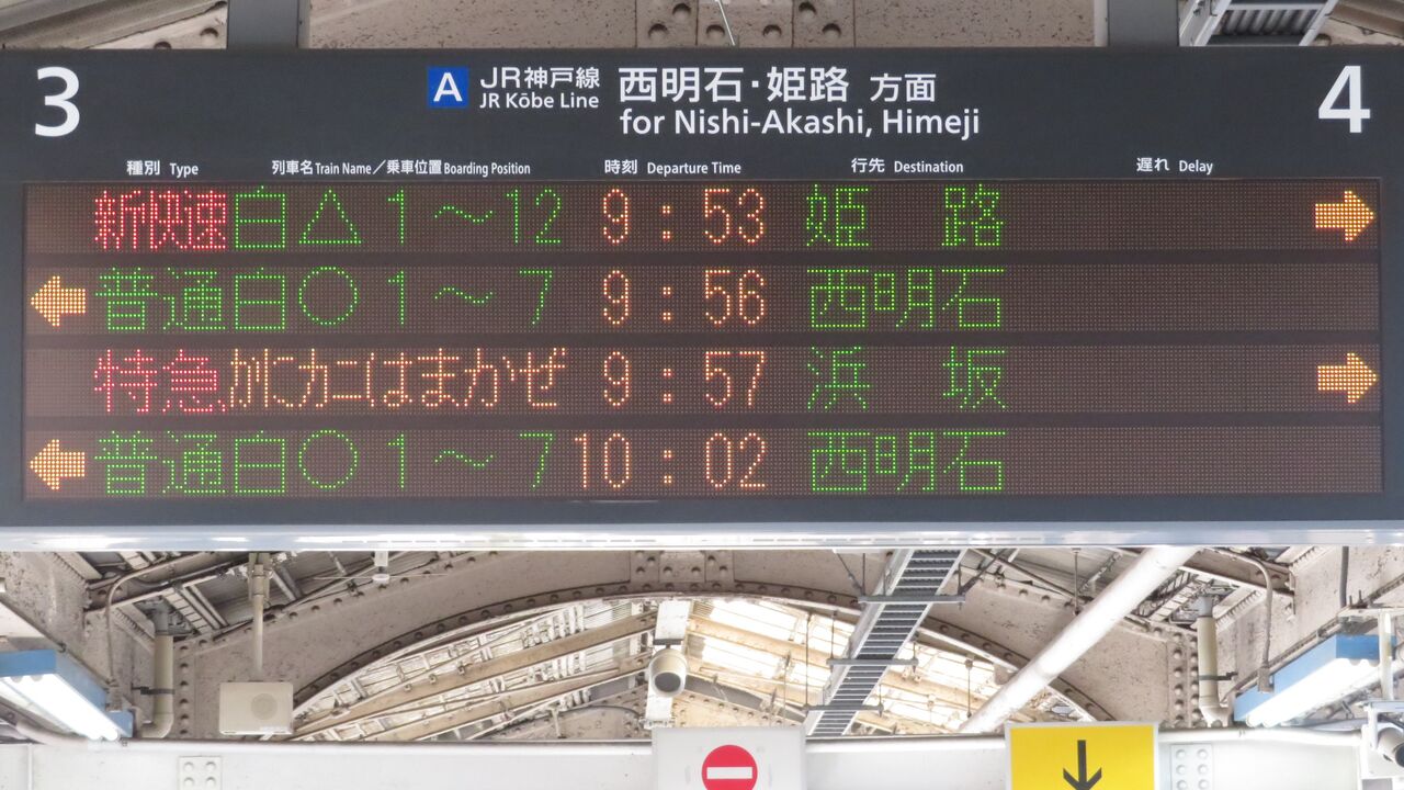 9時47分発の普通 西明石行きが発車すると、一番下の段に臨時特急 「かにカニはまかぜ」 浜坂行きが表示されました。