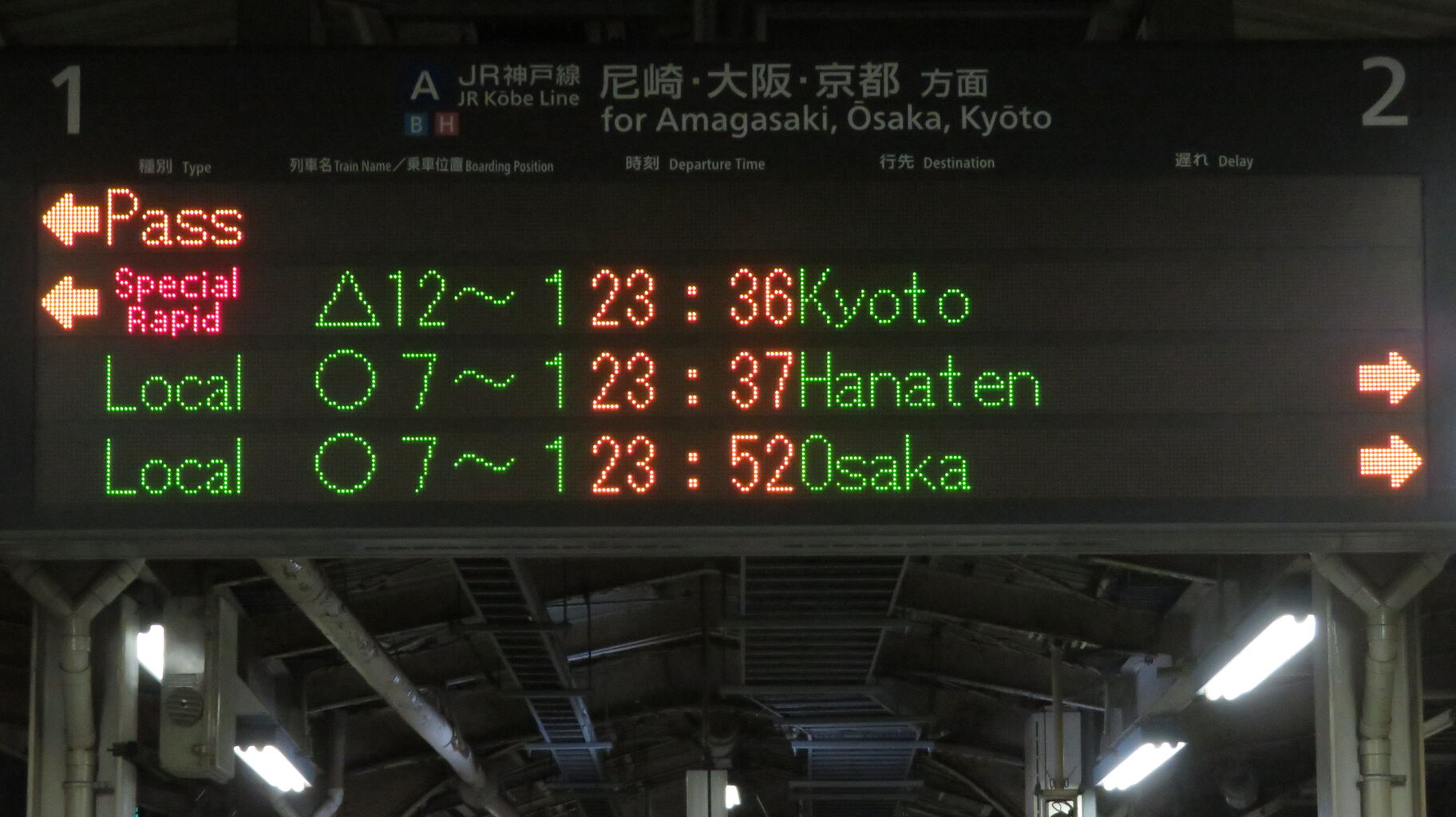 ホームへ上がって、1・2番のりばに設置されている発車標を撮影。