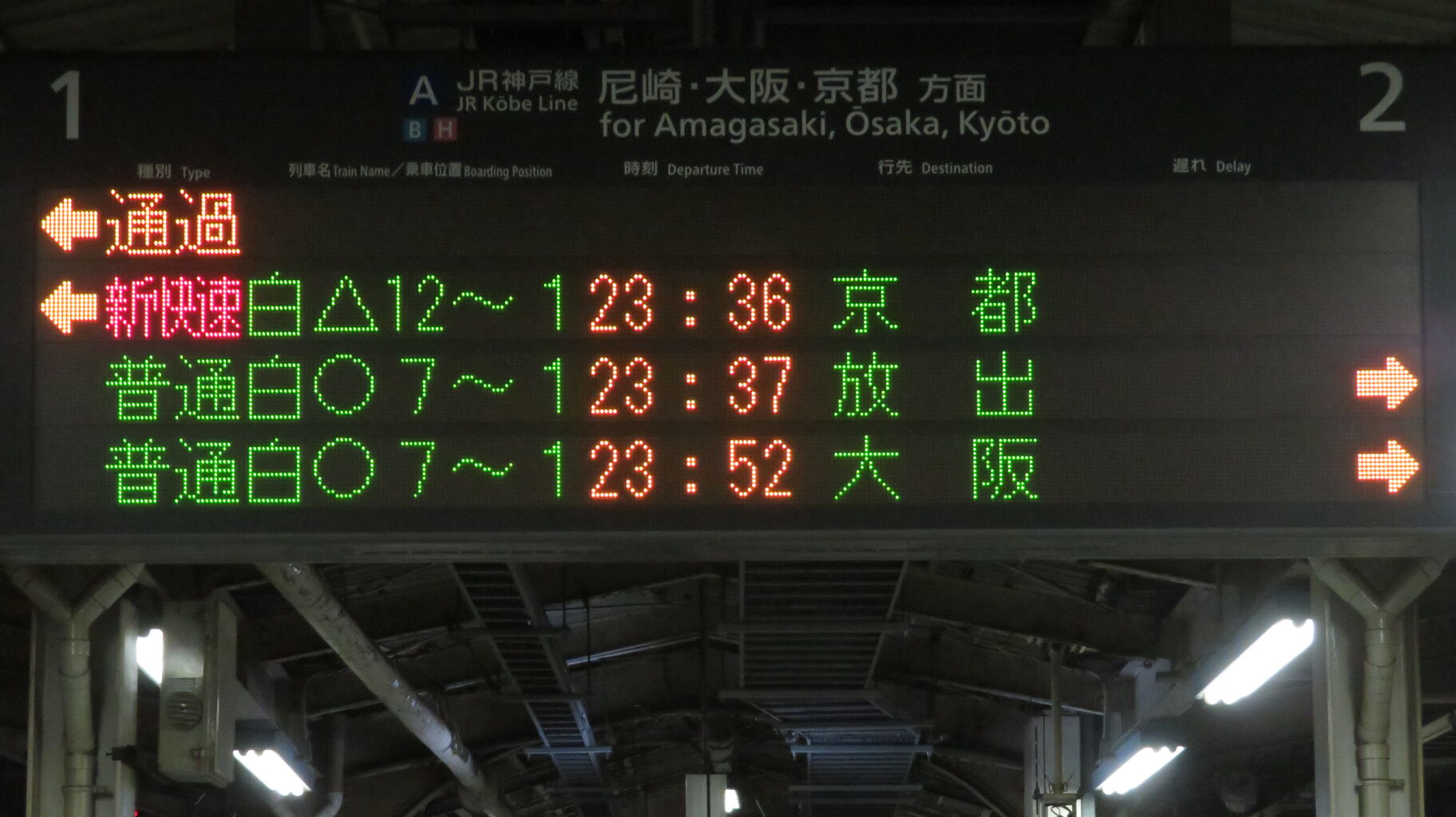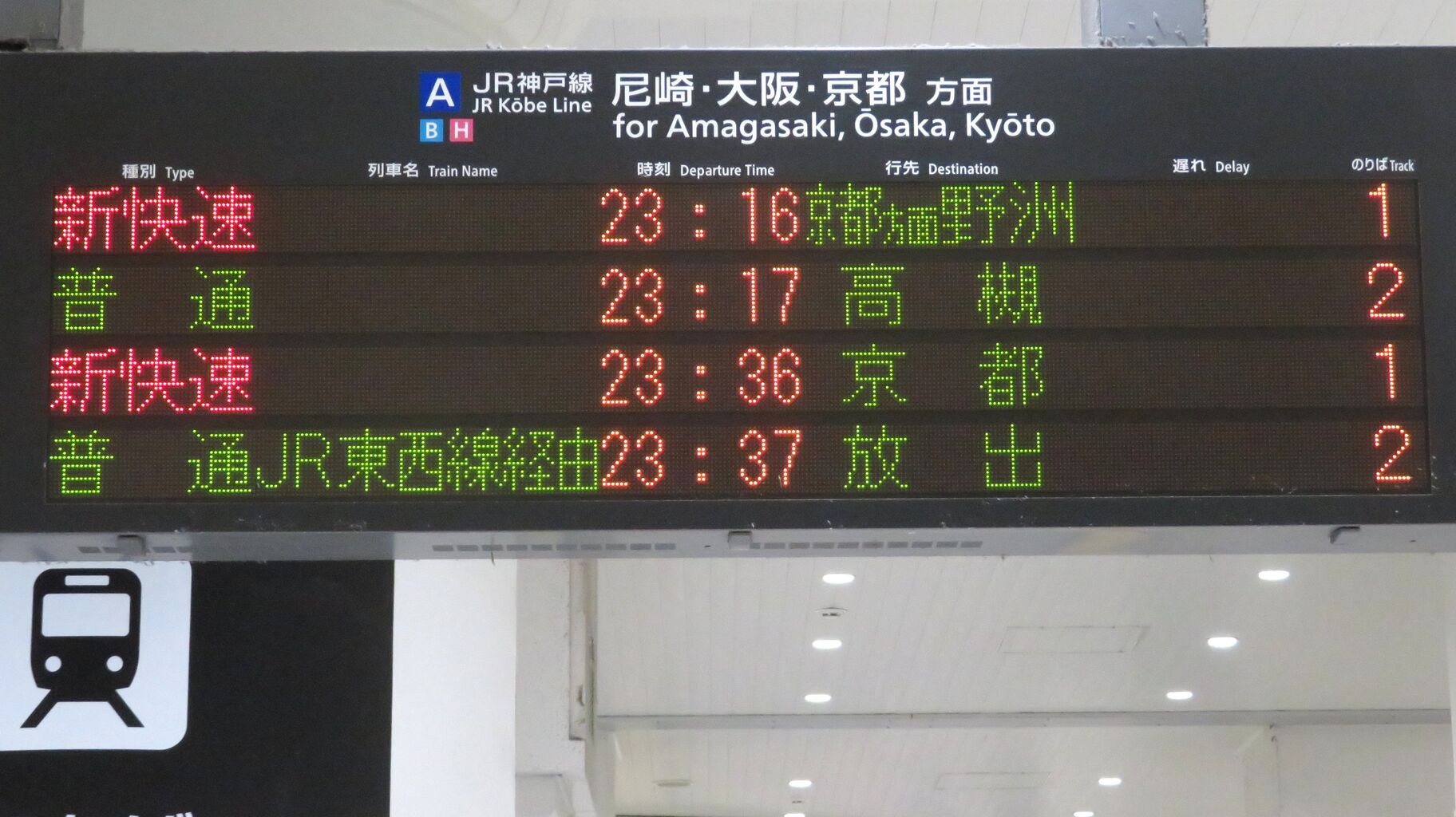 一番下の段には、普通 大阪行きの最終列車が表示されています。