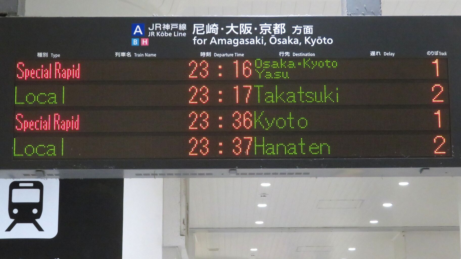 真ん中の段に、新快速 「京都行き」 の表示が出ています。