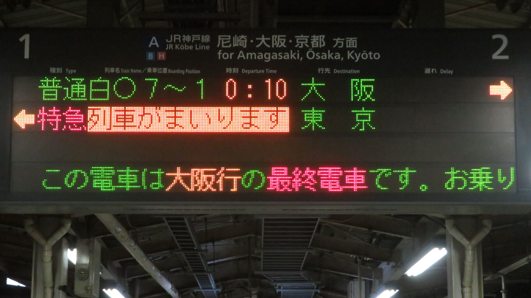 0時10分発の普通 大阪行きは、本日の最終列車です。