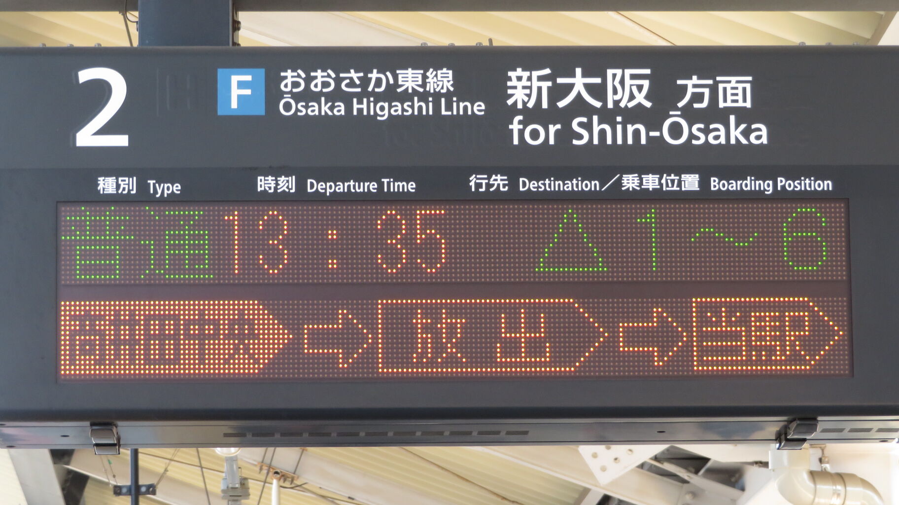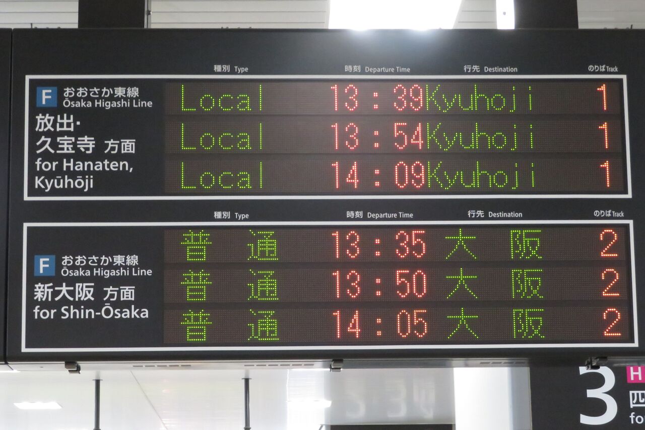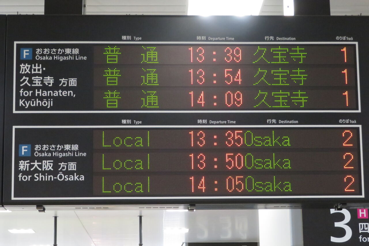 放出駅では 「東線経由 大阪」 と表示されていましたが、この駅では ただ単に 「大阪」 と表示されています。