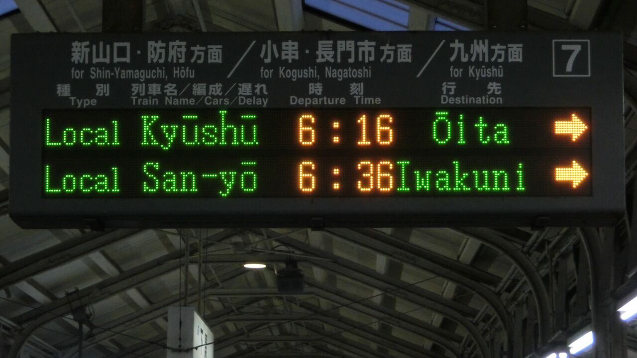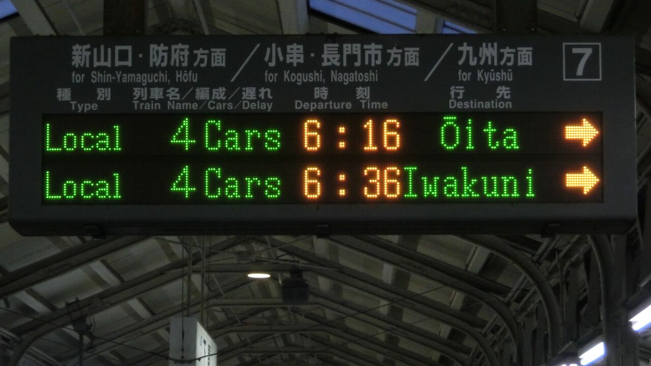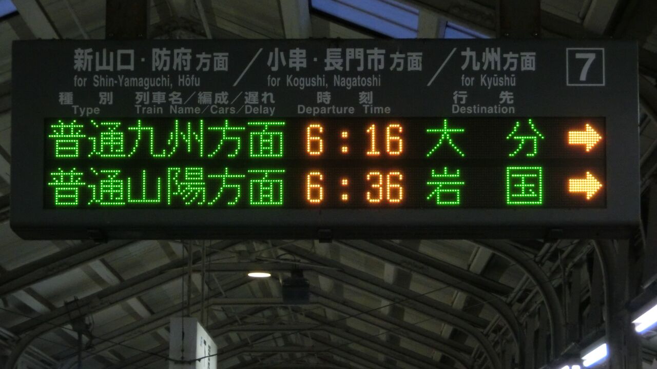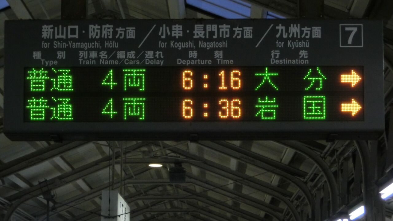 7番のりばの発車標に、6:36発の岩国行きの表示が出ていました。