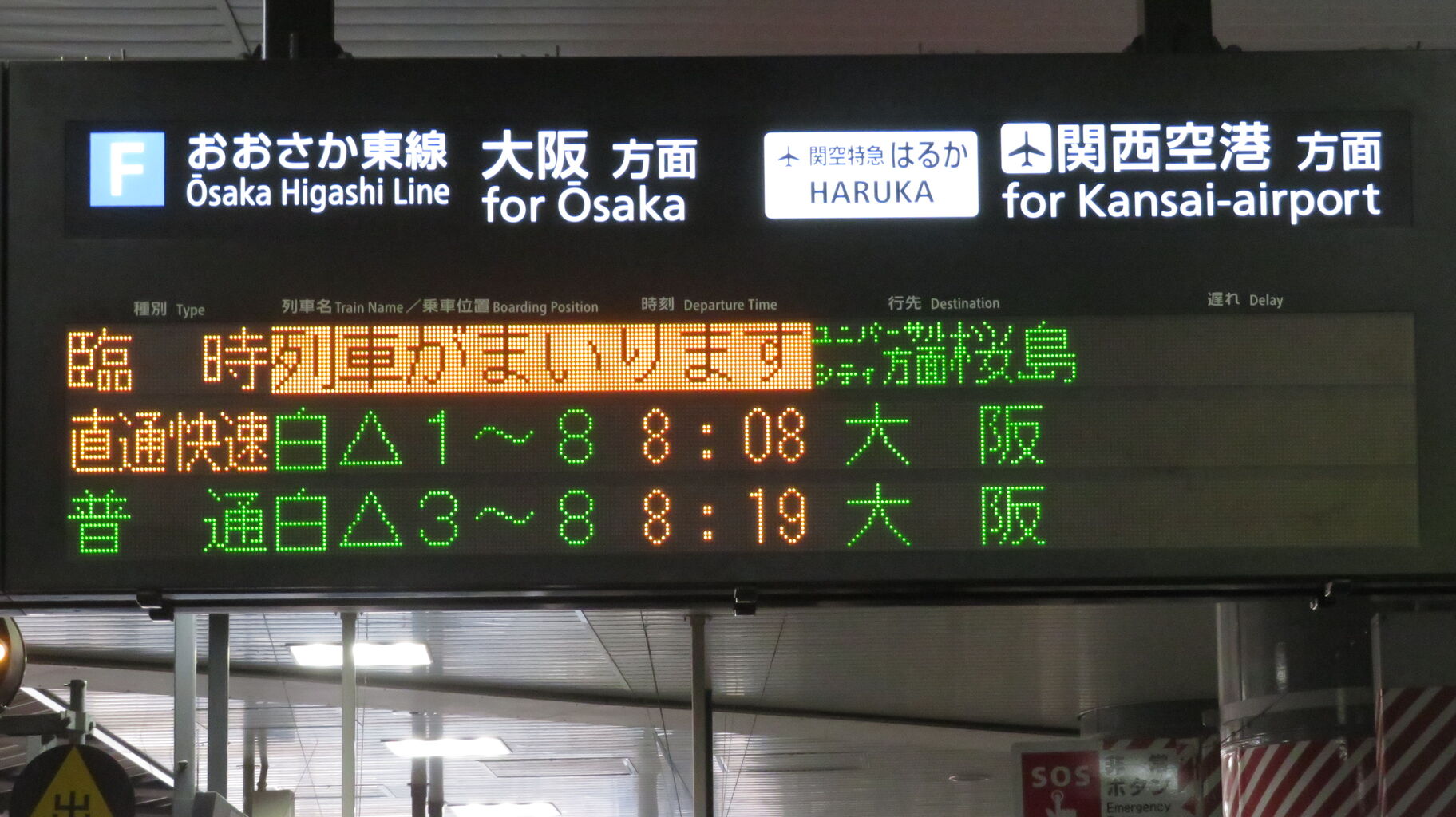 おおさか東線の発車標は、上の2段に久宝寺方面、下の2段に大阪(地下ホーム)方面の発車案内が表示されます。