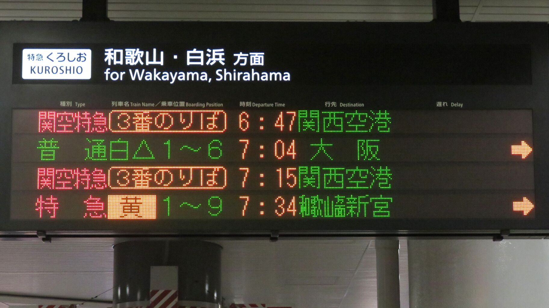 エキスポライナーは基本的に2番のりば発着ですが、2番のりばの発車標に7:32発のエキスポライナーが表示されていません。