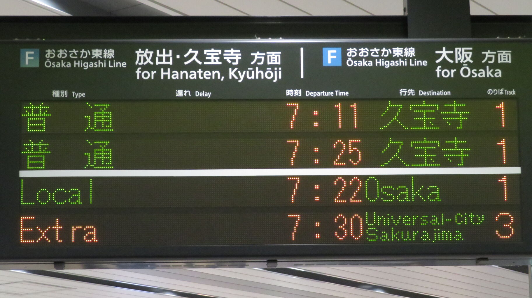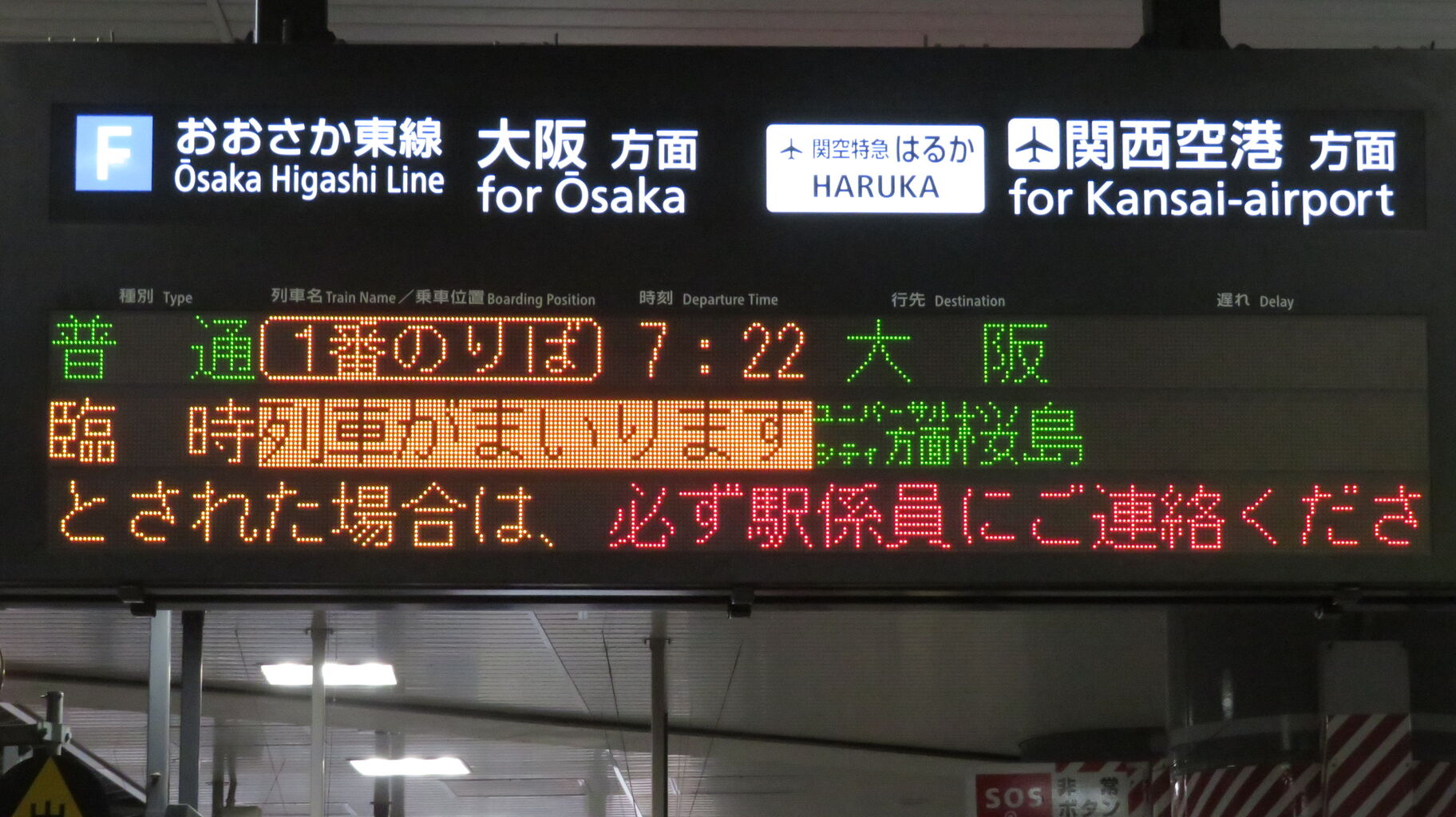 おおさか東線の大阪行きは 基本的に3番のりばから発車しますが、7:22発の大阪行きは1番のりばから発車します。