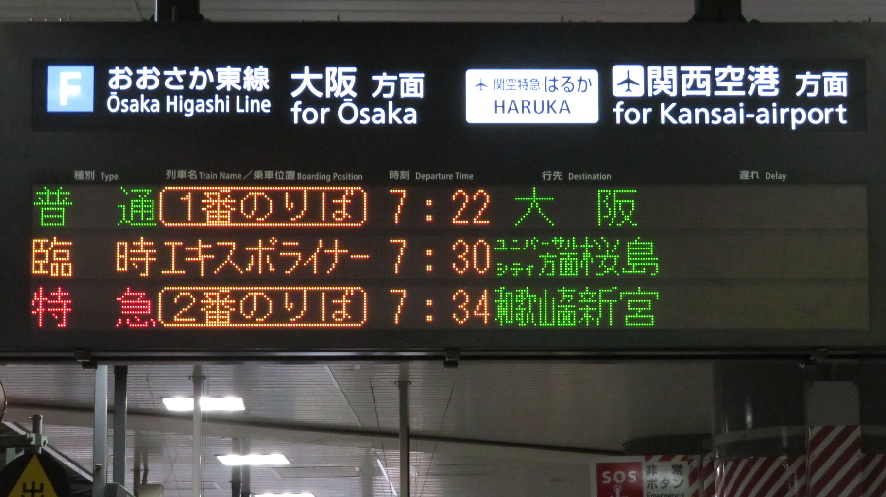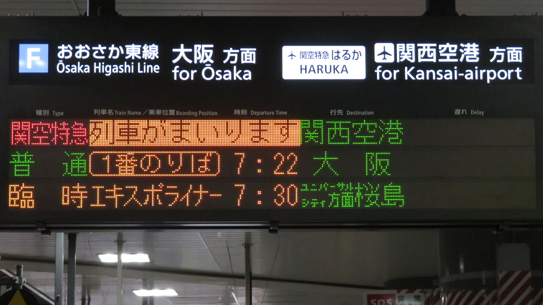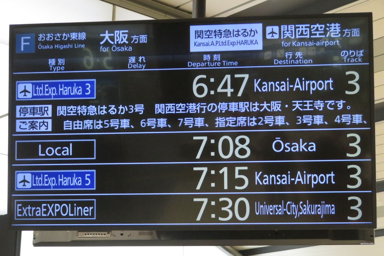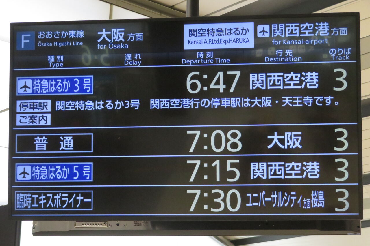 隣のホーム 3番のりばから発車する関空特急はるか 関西空港行きも表示されていますが、同じく3番のりばから発車する 7:30発のエキスポライナーは表示されませんでした。