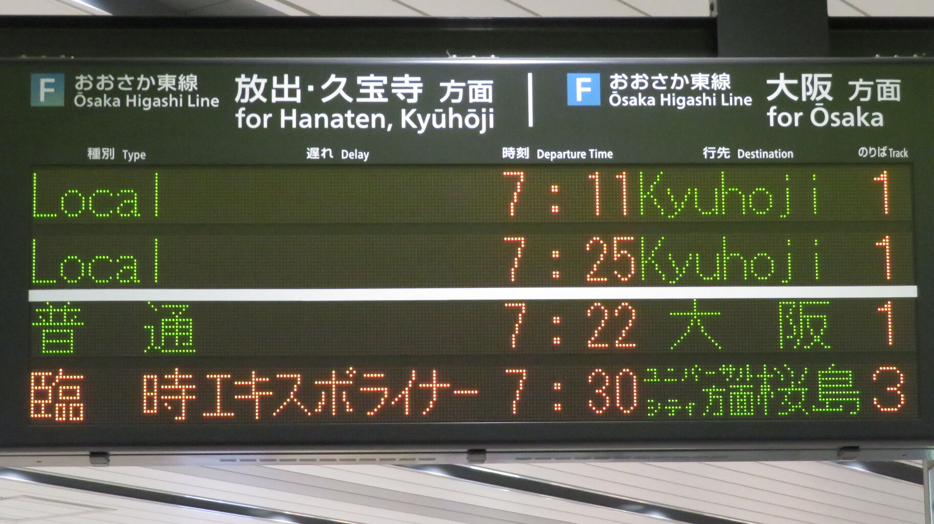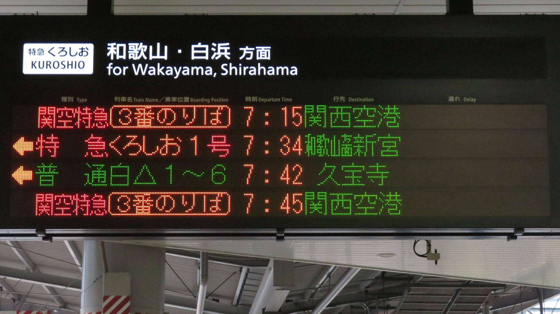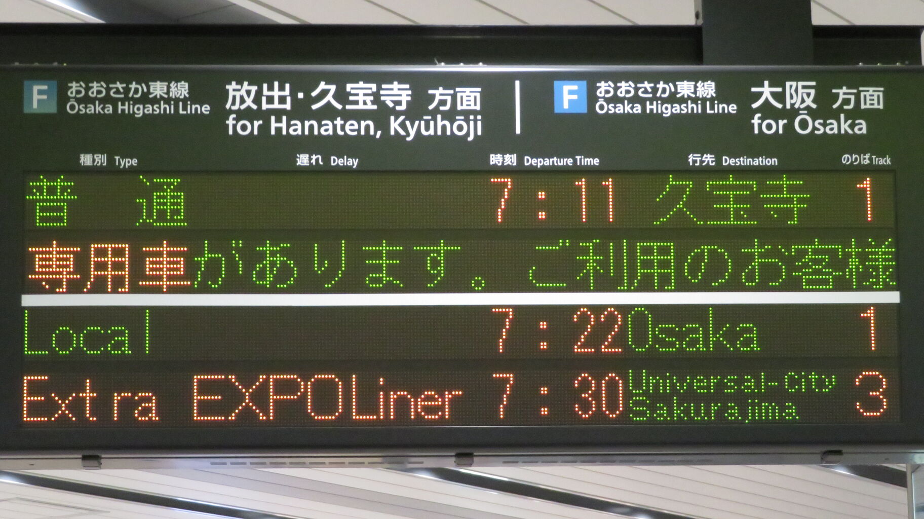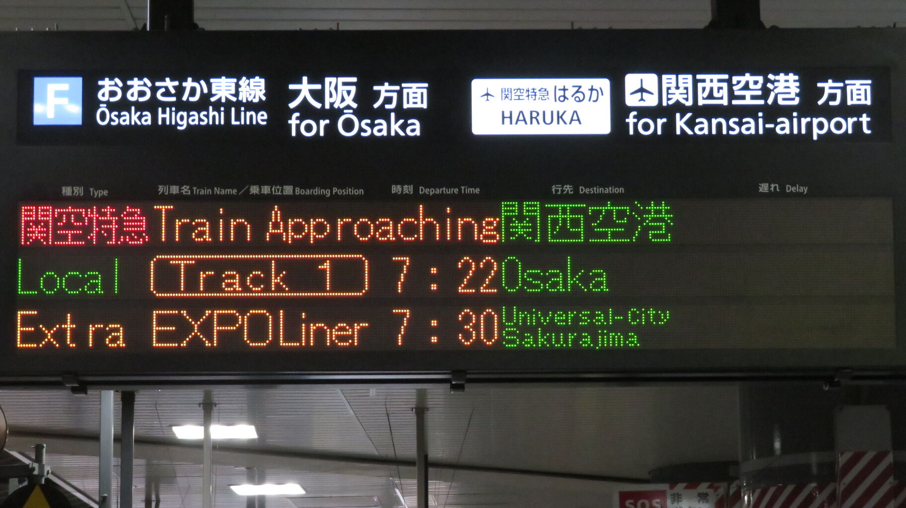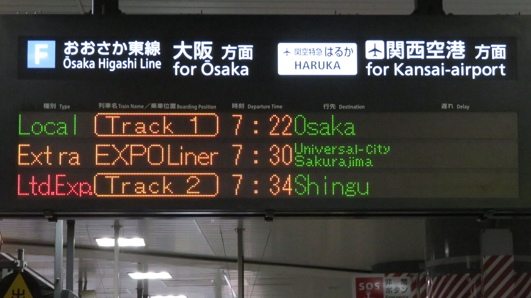 隣のホーム 3番のりばから発車する関空特急はるか 関西空港行きも表示されていますが、同じく3番のりばから発車する 7:30発のエキスポライナーは表示されませんでした。