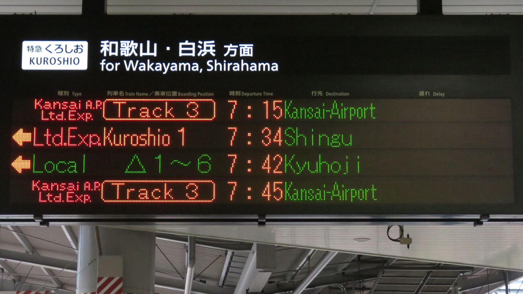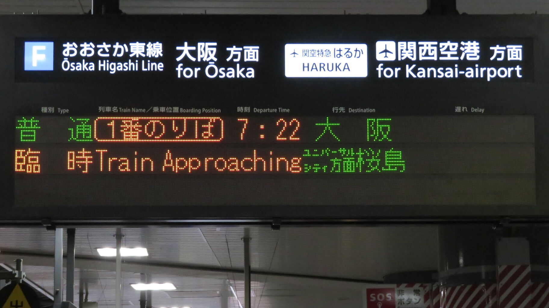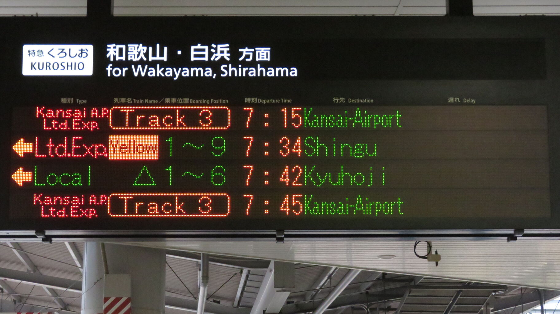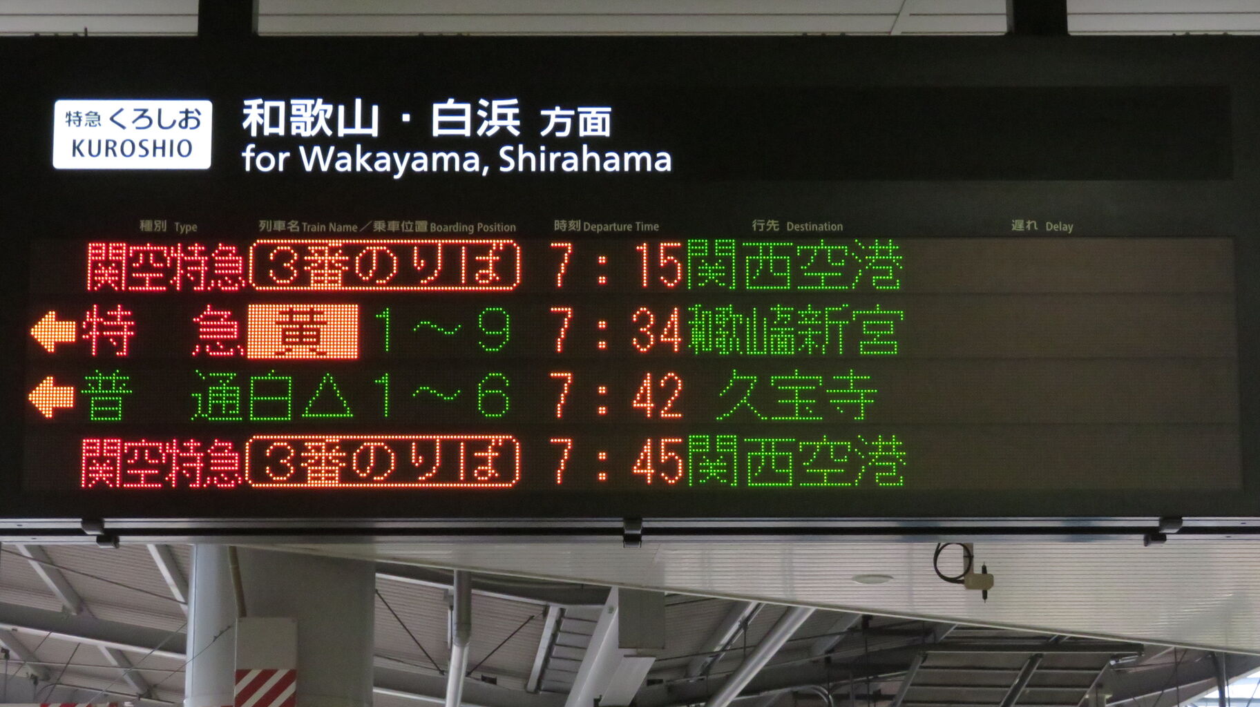 隣のホーム 3番のりばから発車する関空特急はるか 関西空港行きも表示されていますが、同じく3番のりばから発車する 7:30発のエキスポライナーは表示されませんでした。