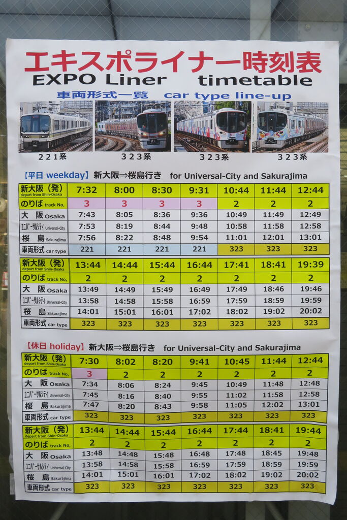 まずは、新大阪駅に掲示されている エキスポライナーの時刻表を見ておきましょう。