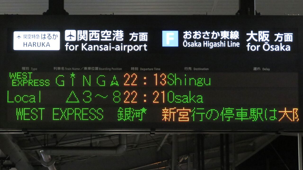 大阪駅のLCD発車標は、「WEST EXPRESS 銀河」 の表示が 青地に白文字 でしたが、新大阪駅では 黒地に白文字 になっています。